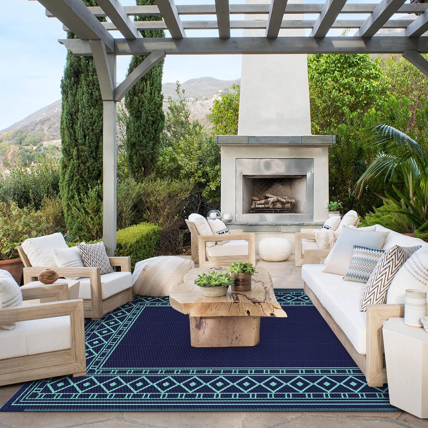 GENIMO Outdoor Rug Waterproof 5'x8' for Patio, Foldable Reversible Plastic Straw Carpet for Travel Trailers, Outside Area Mat for Rv, Deck, Picnic, Porch, Balcony, Beach, Navy Blue & Jade Green