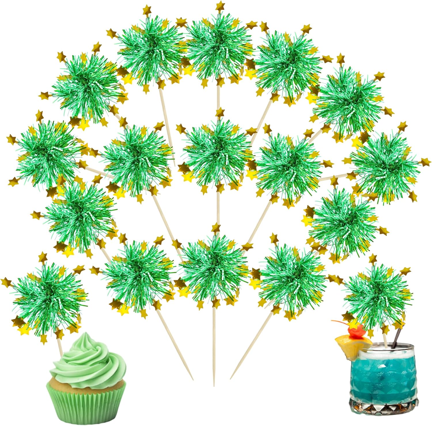Ephlyn 30Pcs Foil Firework Cupcake Toppers Happy Birthday Cake Toppers Tinsel Flower Drink Stirrers Cocktail Food Fruit Toothpicks for Valentine's Day Party Decorations Green