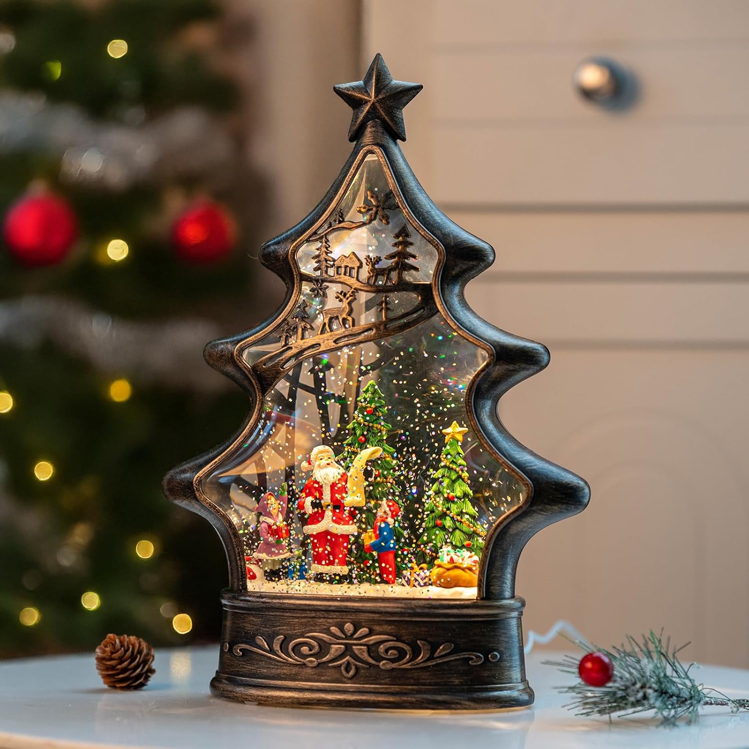 - đăChristmas Snow GlobeăBronze glitter tree lantern with a cut out decorative design on the front and back. Inside, Santa reading his list to the kids as they gather gifts, bringing in Holiday Cheer! When turned on a warm LED shines on the figurine and swirling glitter to gives our Christmas globe a whimsical look for the Christmas Holiday season.
