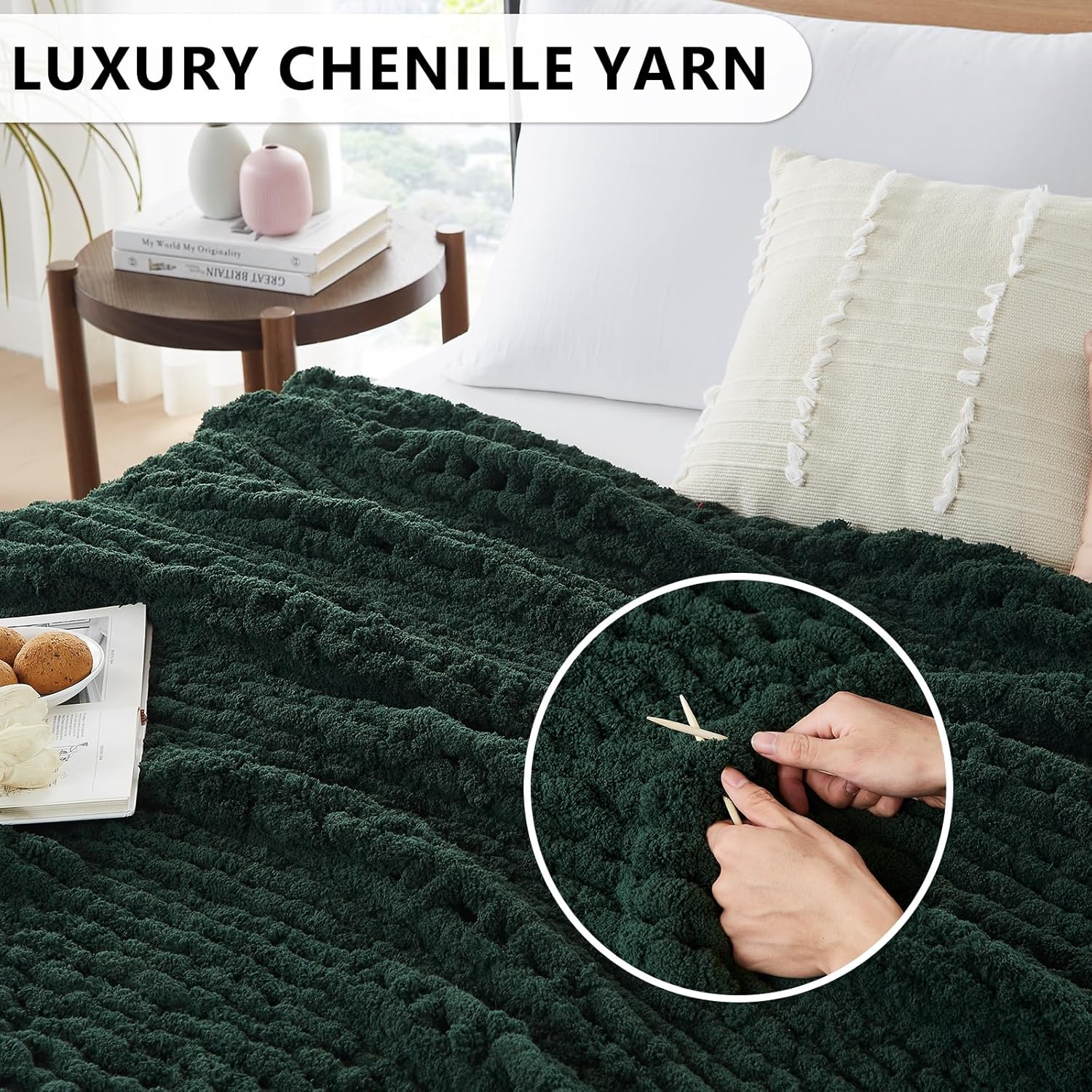 L'AGRATY Chunky Knit Blanket Throw: 72''x84'' Chenille Chunky Knitted Throw Blanket for Bed Couch - Handmade Thick Big Cable Knit Blanket - Large Chunky Crochet Rope Blanket for Home Decor(Green)