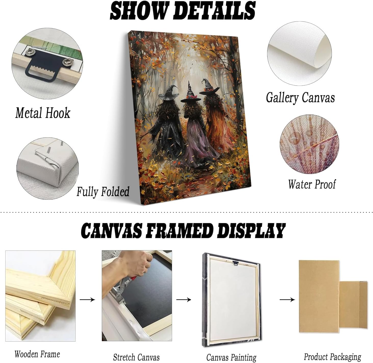 Vintage Three Witches In The Forest Painting Witch Print Witchy Canvas Print Halloween Wall Art Halloween Decor Witch Poster Dark Academia Gothic Room Decor for Dorm Bedroom 12x16in Frame wall art