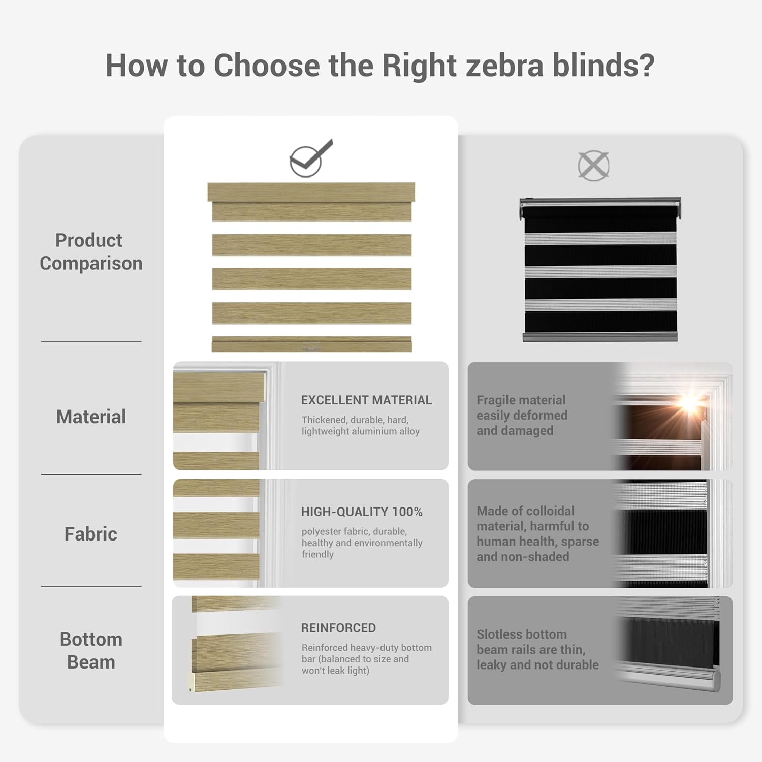 - 【Upgrade High-Quality Accessories】Our blind has been upgraded to have a sturdier bottom rail to prevent the fabric from fraying, which makes the two layers of fabrics more closely fit, maximizing the effect of shading. An anti-collision strip installed under the rail for protecting your window frame. Color-matched valance and the aluminum bottom bar suitable for all situations.