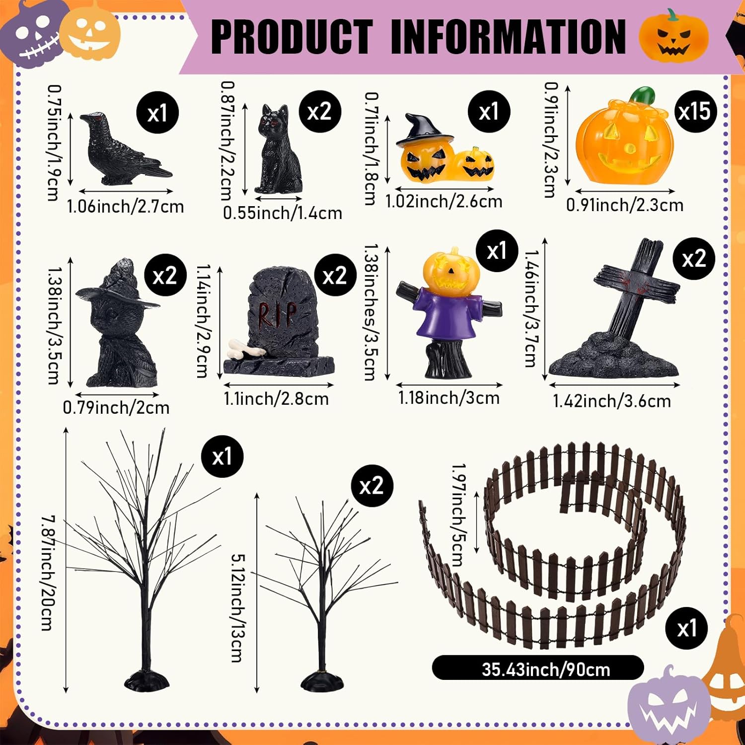 - Multiple Size Variations: halloween black branches is about 7.87 inches/ 20 cm and 5.12 inches/ 13 cm; Fence is about 1.97 x 35.43 inches/ 5 x 90 cm, height of the miniatures ornaments is generally within 1.57 inches/ 4 cm; Allowing you to create a dynamic Halloween scene