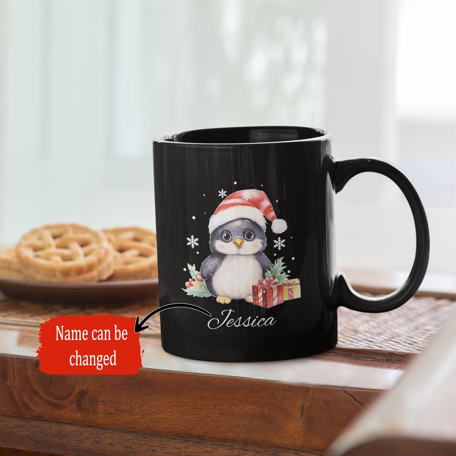 - 💝 UNIQUE DESIGN MUG: Celebrate the holidays with this "Customized Christmas Themed Black Cup" featuring a penguin in a Santa hat surrounded by gifts and festive greenery. Click "Customize Now" to add a name, creating a delightful and personalized gift for the holiday season. This black ceramic mug is great for enjoying your favorite winter beverages.