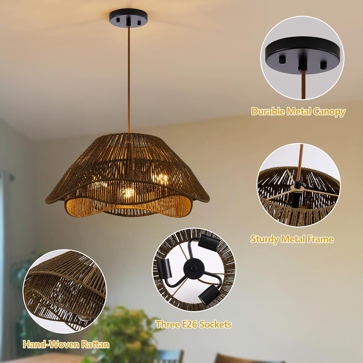 Rattan Pendant Light Fixture Ceiling, 19.68”Hand Woven Wicker Chandelier, Rustic 3-Light Large Hanging Lamp, Adjustable Boho Flush Mount Hanging Light for Dining Room Kitchen Living Room