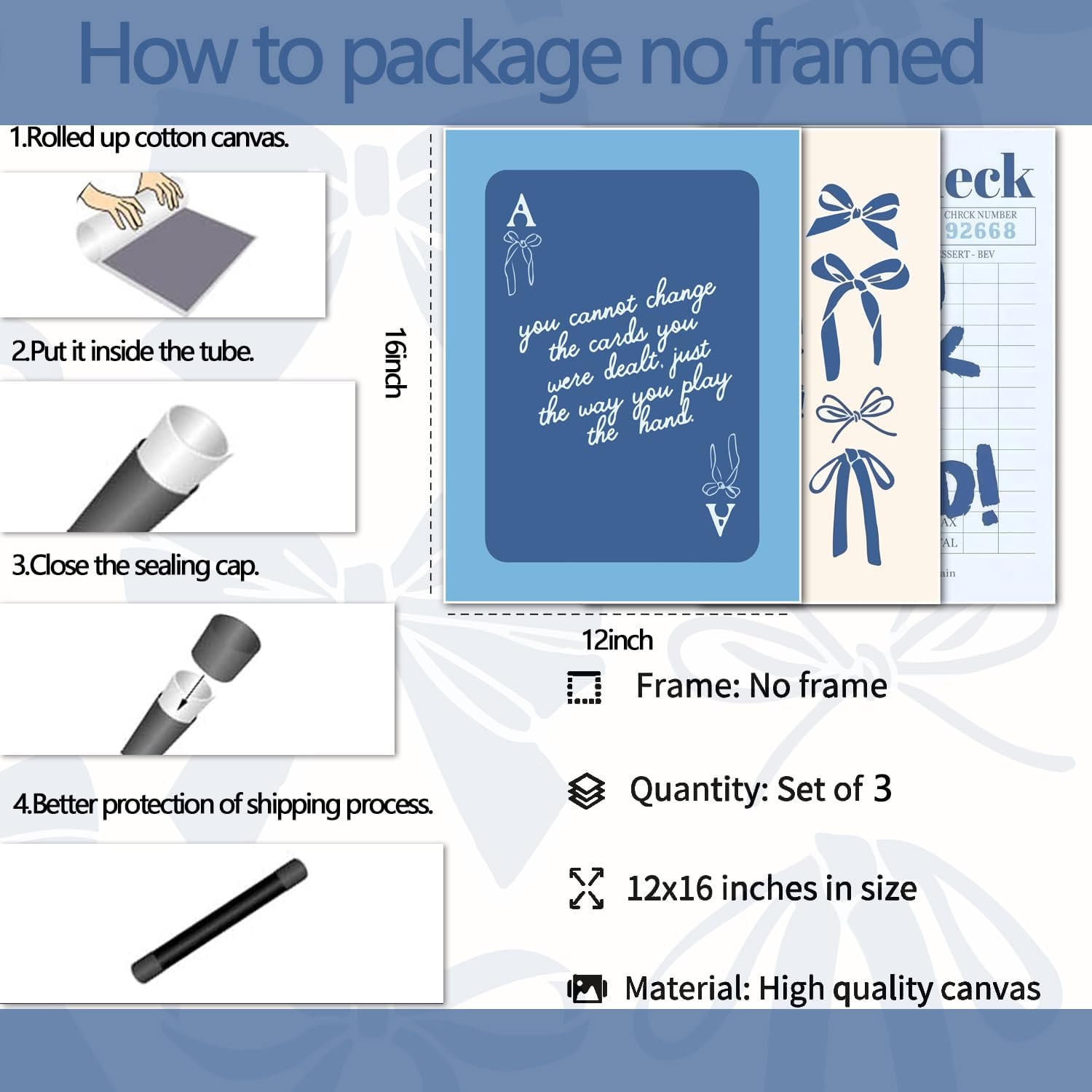 Blue Preppy Wall Art Set of 3 Trendy Navy Bow Posters Retro Guest Check Canvas Prints Poker Painting Minimalist Positive Quote Picture Decor Aesthetic for Living Room Dorm Apartment 12x16in Unframed