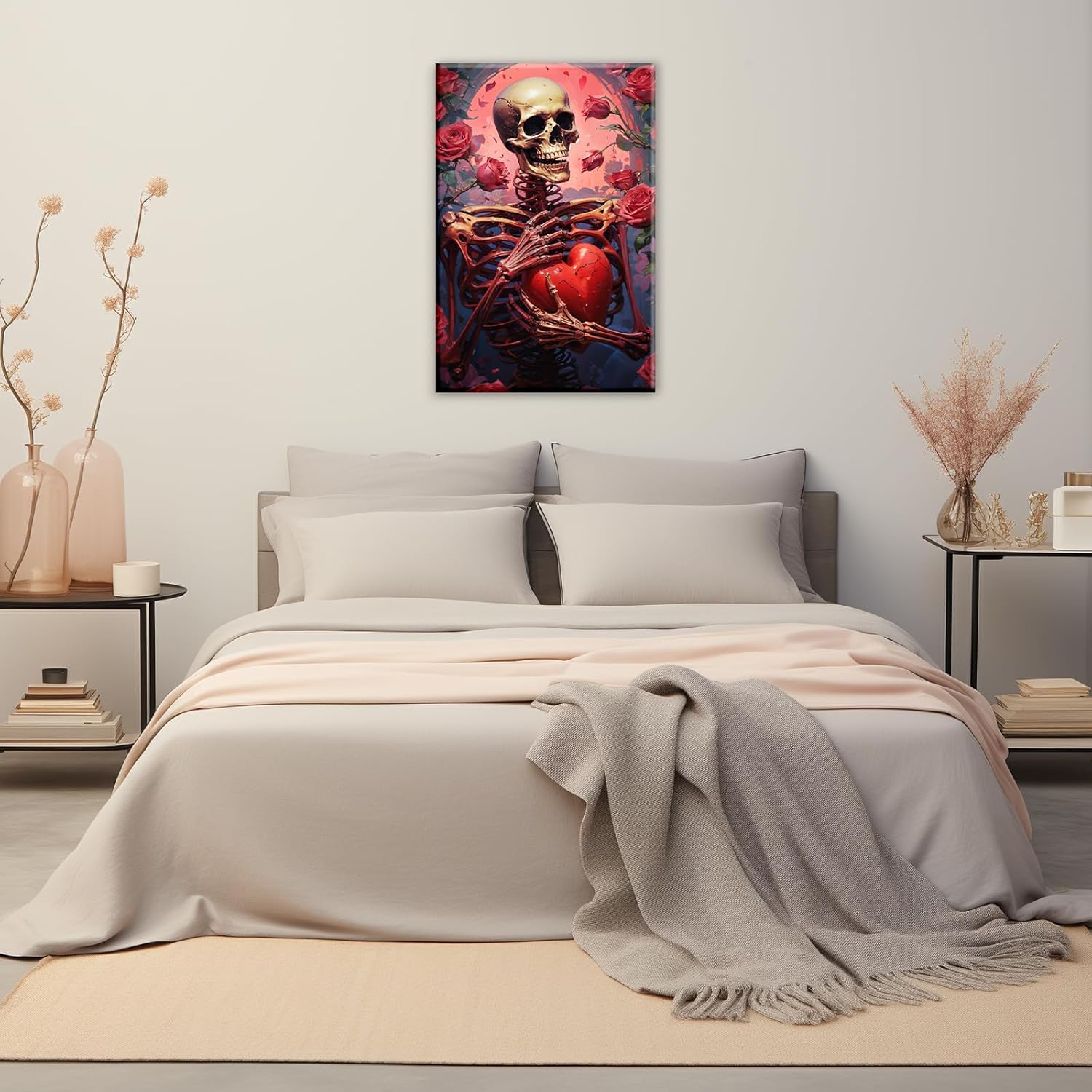 OAAPITI Skull Skeleton Canvas Wall Art Skull Holding Heart Picture Print Romantic Theme Painting Artwork Gothic Poster Wall Decor Living Room Halloween Decor(Artwork-1,12"x18")
