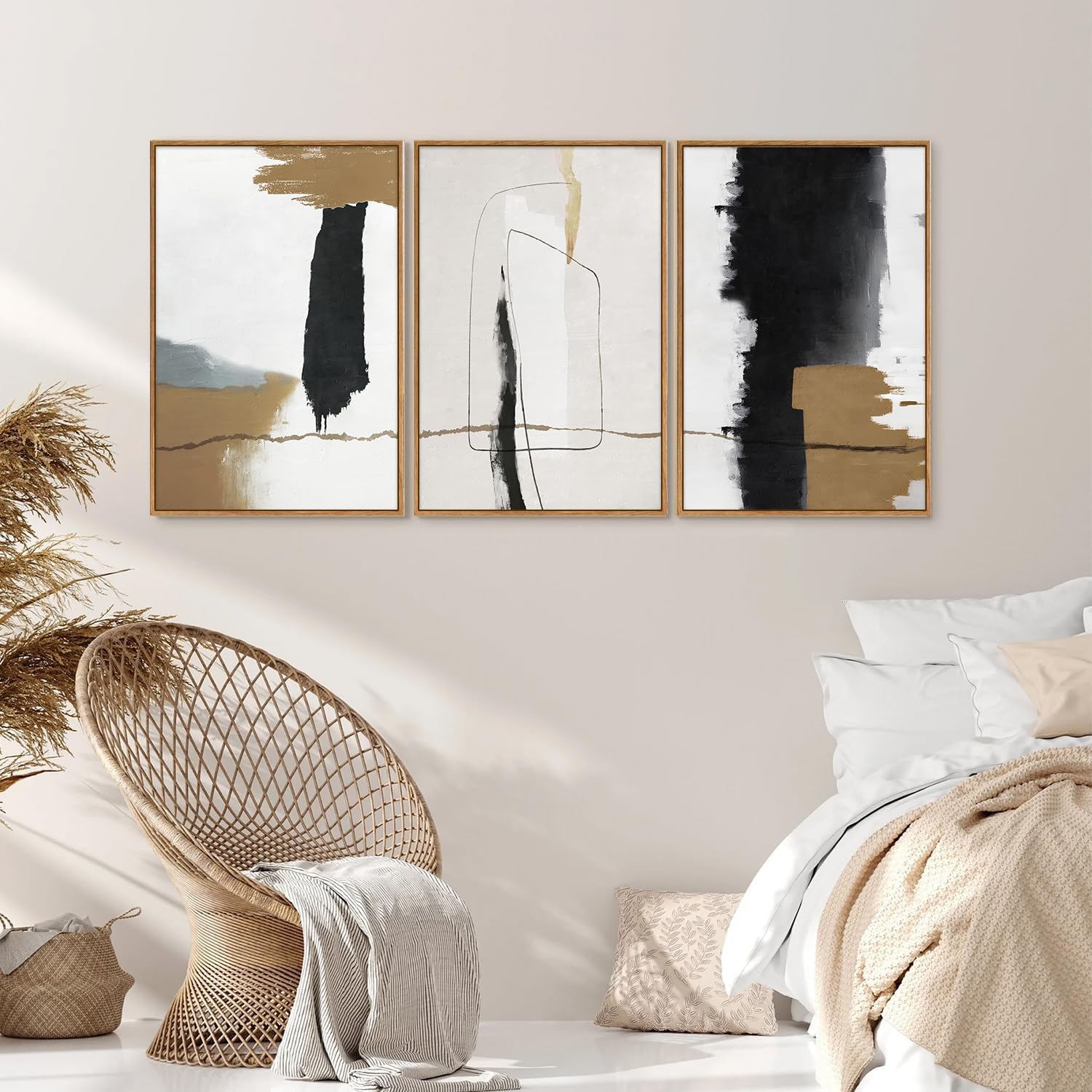 SIGNINART Black and White Abstract Framed Canvas Wall Art Set of 3, Beige Neutral Art Prints, Minimalist Modern Wall Decor for Living Room, Bedroom, Office,Above Couch 16"x24"x3