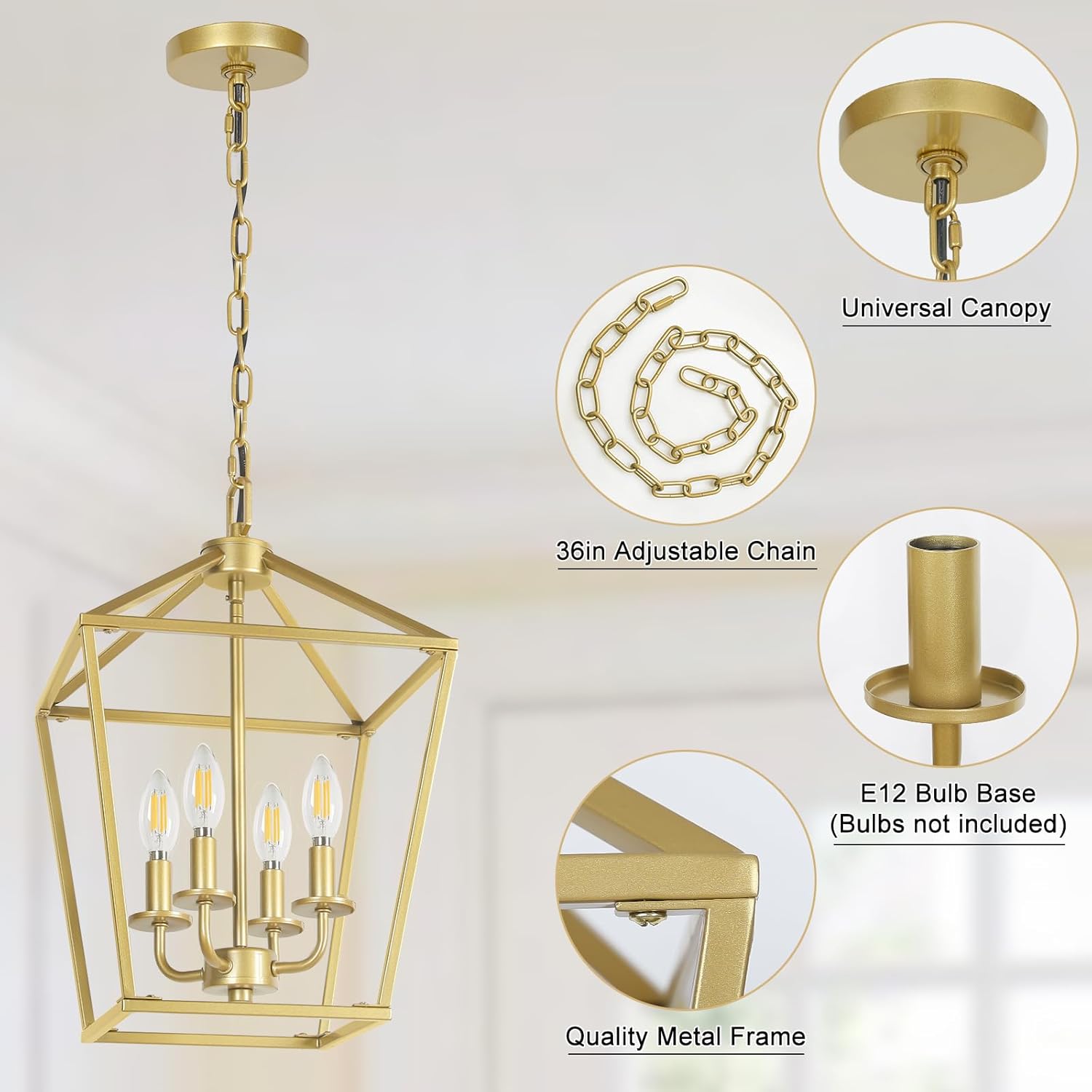 - Gold and Stylish Appearance: Featured with gold center candlestick and geometric outward appearance, the geometric lantern chandelier is a wonderful addition to add industrial touch to your home décor. Artistic and eye-catching, it can perfectly blend in any place such as bedroom, living room, bathroom, dining room, hallway or kitchen island (indoor use only)