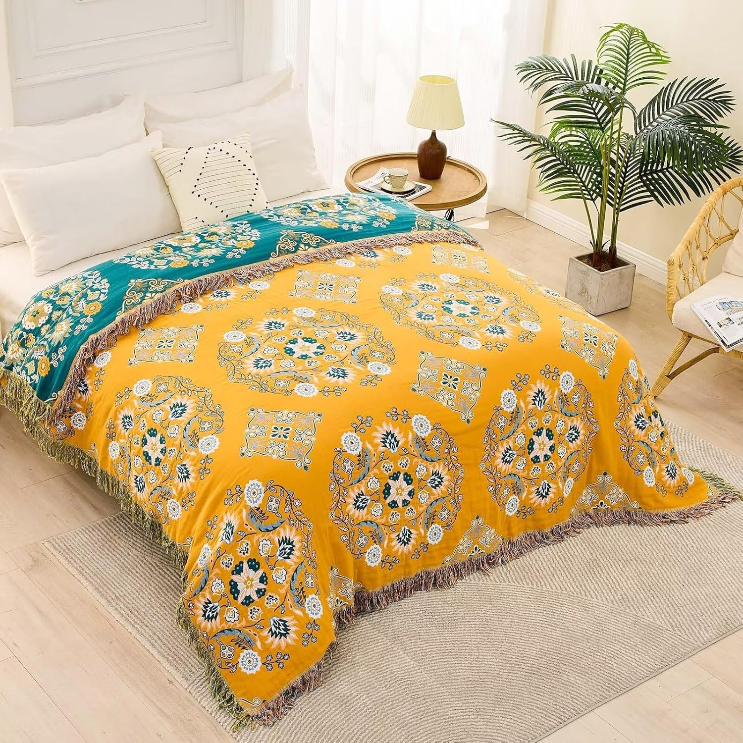 Boho Throw Blanket, 100% Cotton Ultra Soft Luxury Throw Rustic Quilt, Floral Printed Farmhouse Decor Bed Summer Blankets, All Season Rustic Reversible Bohemian Throw for Bed (60"x80" Yellow