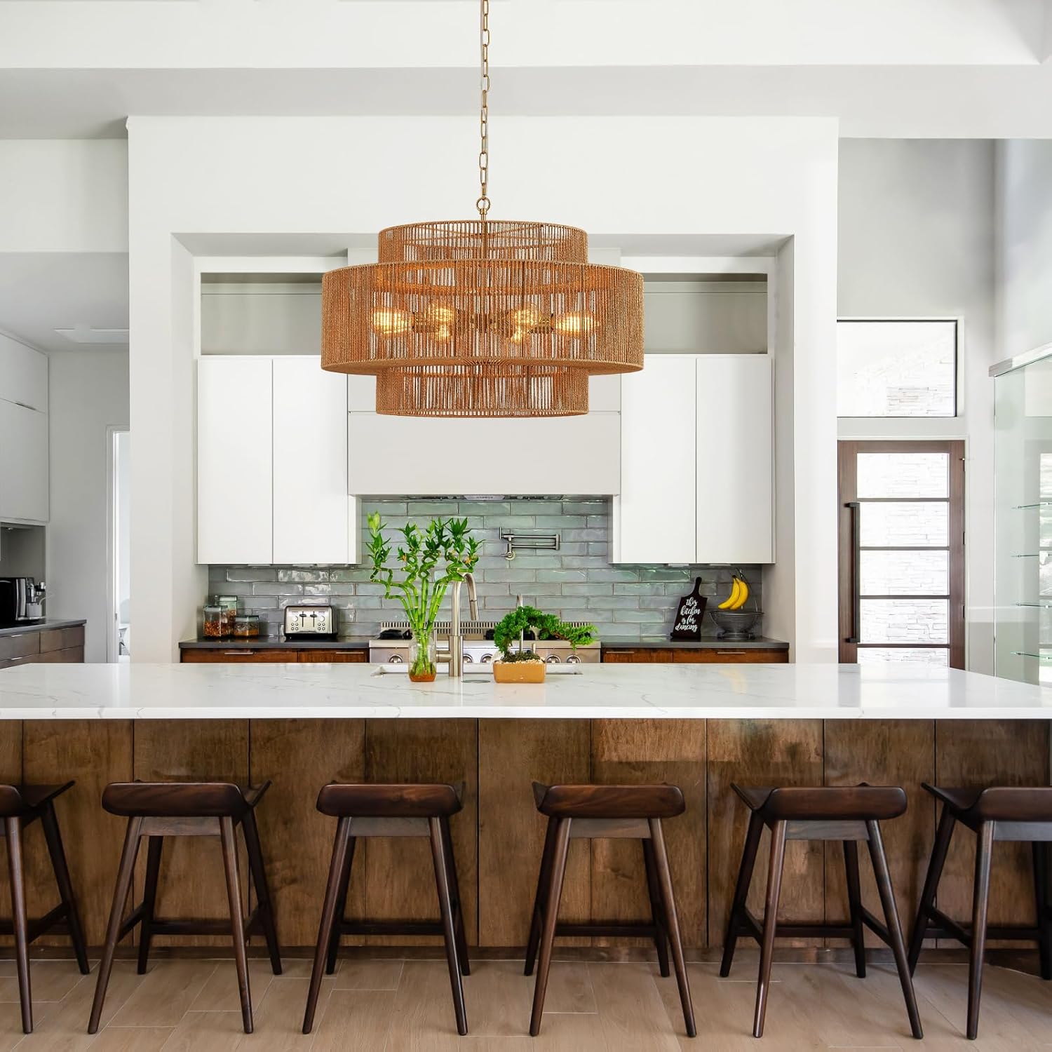 - 【Perfect for Any Room】This hand woven rattan chandelier is a versatile addition that creates a warm and inviting atmosphere, whether it's your dining room, living room, bedroom, or kitchen.