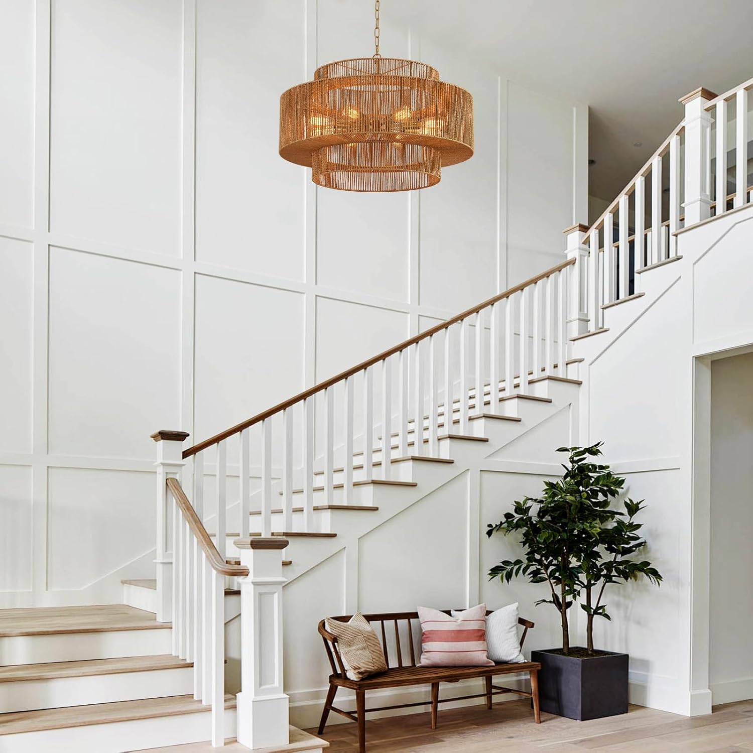 - 【3-Tire Design】The large 3-tier rattan chandelier's simple wicker weave and golden finish metal frames bring a vintage bohemian style. This big farmhouse chandelier light fixture features three round metal frames that form a captivating semicircular hollow cage. This design sets it apart, adding an element of sophistication.