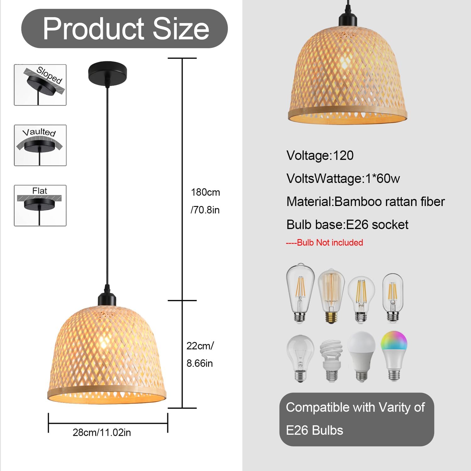 - 【BULB REQUIREMENT】Size 28*22 cm/11.02*8.66", Voltage 110v~240v, Bulb socket and electric cord have passed the UL listed, which can ensure that you use them safely. US standard E26 base socket, maximum 60W, suitable for Incandescent, LED, halogen, CFL, etc.(Bulb Not included)