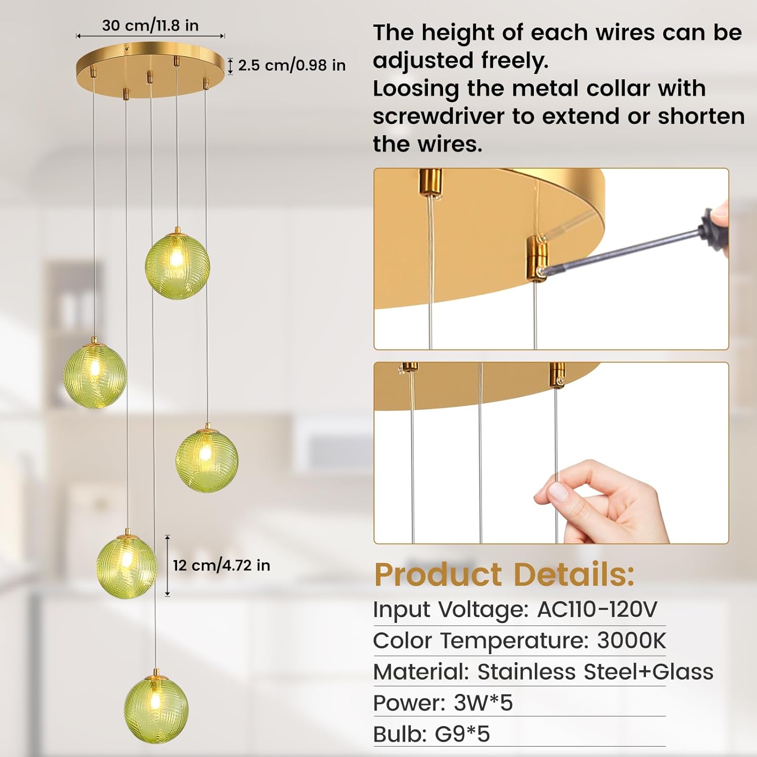 - Dimensions: The stainless - steel ceiling plate is 11.8 inches wide. The adjustable hanging wire has a maximum length of 69 inches, and each glass ball is 4.72 inches wide. The 69 inch adjustable height design can meet different usage requirements in various environments.