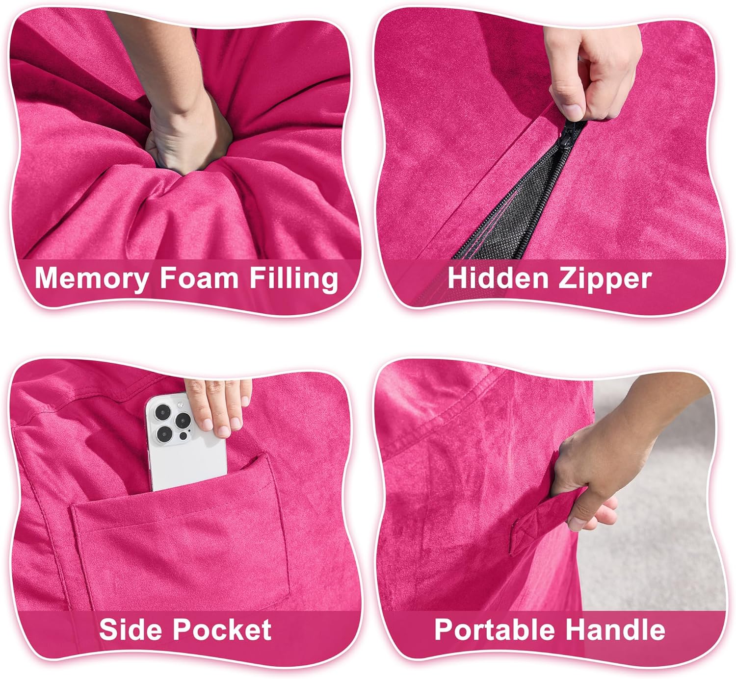 - Convenient Design: Our adult bean bag chair is designed with handle so you can move the giant bean bag chair wherever you want. The adult bean bag chair has a medium sized pocket on the side to store your phone, remote control, books and some small items. With the hidden zipper, you can remove the bean bag cover and throw it in the washing machine for cleaning.