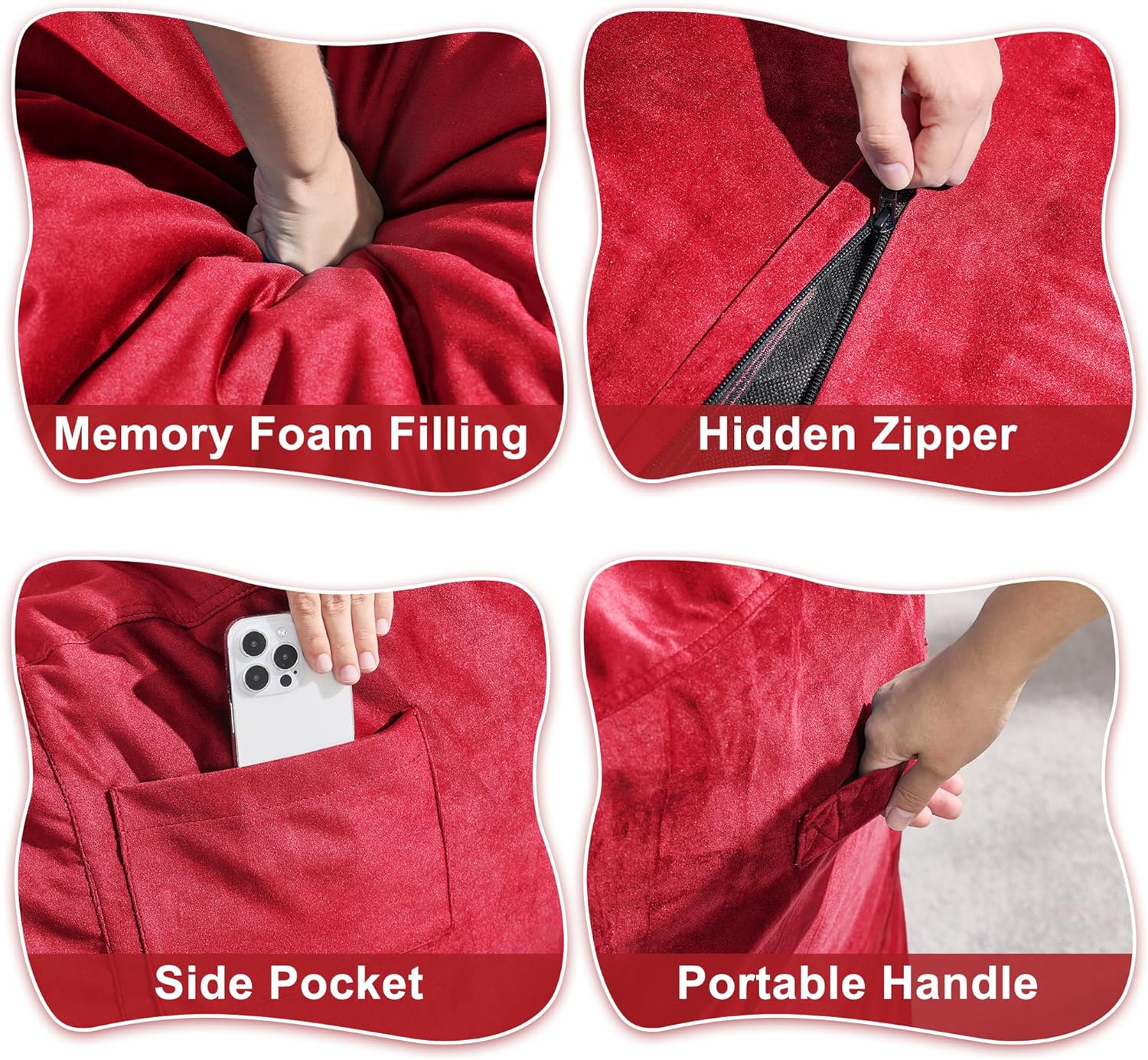- Convenient Design: Our adult bean bag chair is designed with handle so you can move the giant bean bag chair wherever you want. The adult bean bag chair has a medium sized pocket on the side to store your phone, remote control, books and some small items. With the hidden zipper, you can remove the bean bag cover and throw it in the washing machine for cleaning.