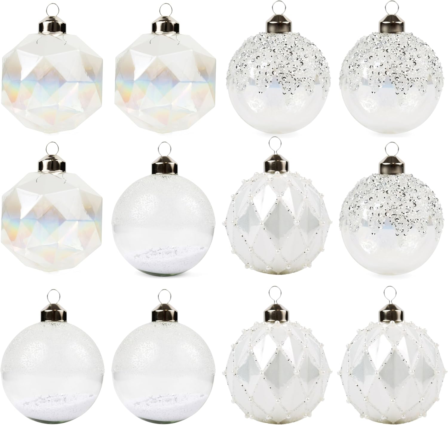 - Add sparkle to your holiday décor with this 12-pack of glass Christmas tree ornaments. Each ornament features intricate detailing and a glittery finish, perfect for elevating your tree’s elegance. Durable yet delicate, these timeless ornaments bring a touch of classic holiday charm and sophistication to your festive celebrations.