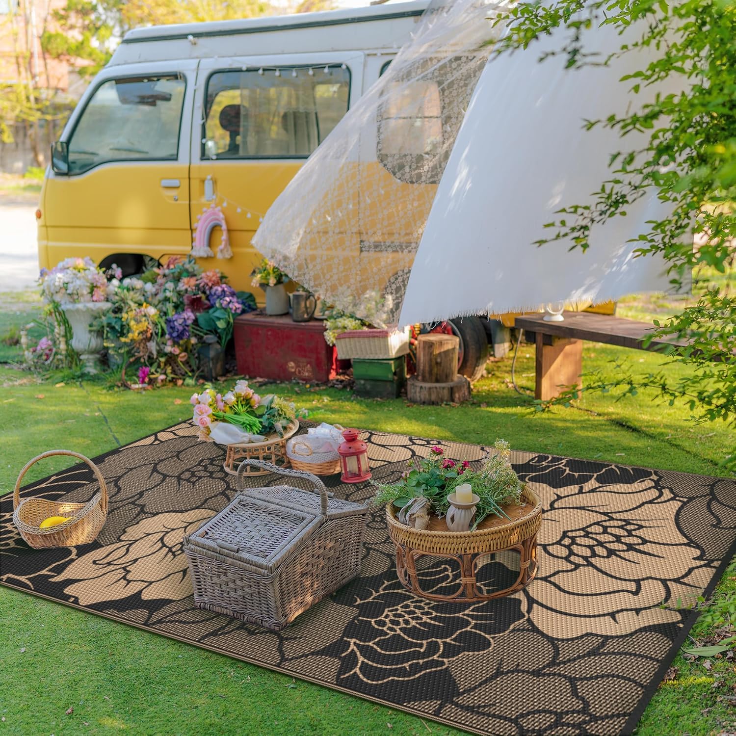 GENIMO Outdoor Rug Waterproof for Patio Decor, 8' x 10' Reversible Plastic Straw Floral Camping Carpet, Large Area Rugs Mats for RV, Camper, Deck, Balcony, Porch, Beach, Picnic, Mix-Black & Brown