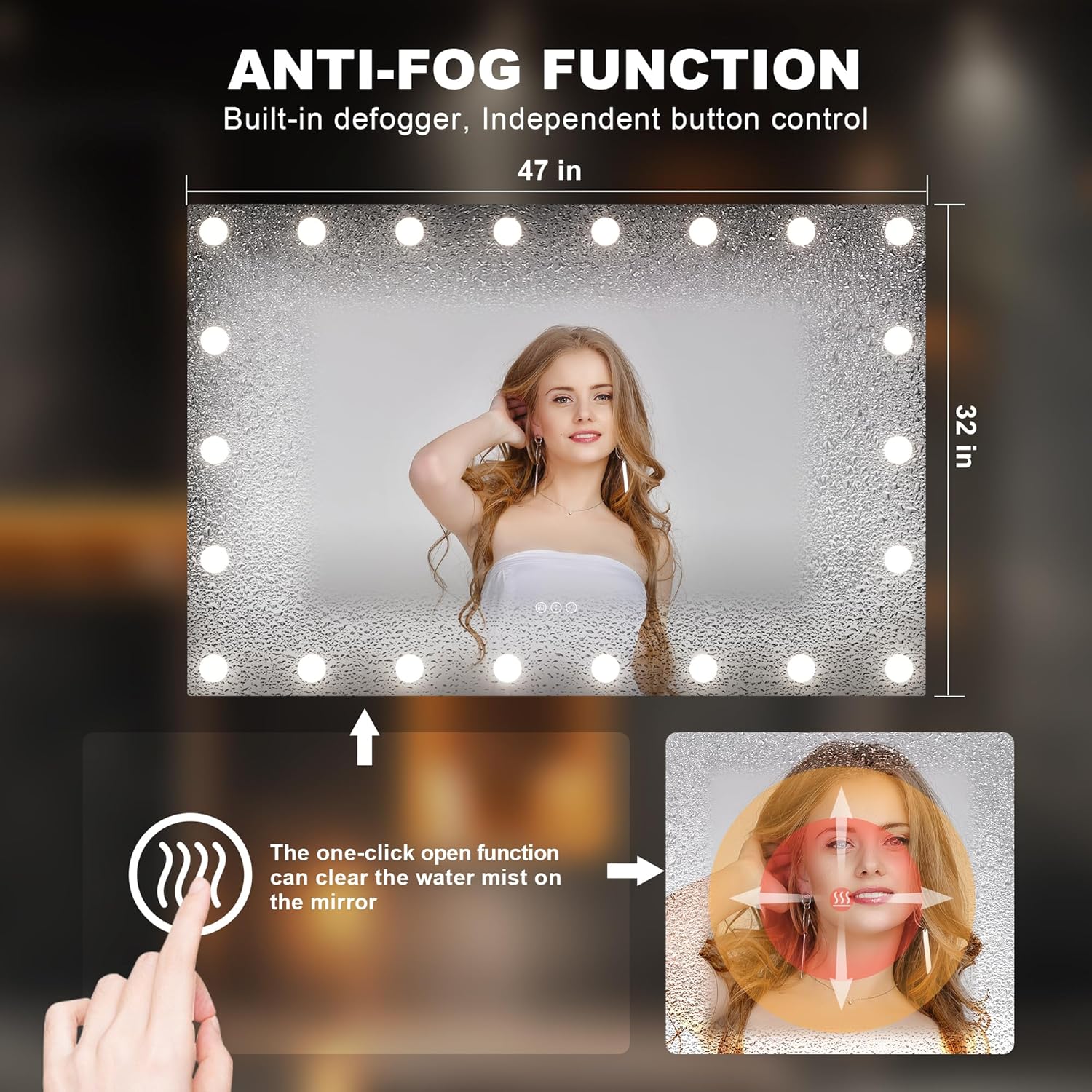 Hasipu LED Bathroom Mirror with Lights, 47" x 32" Hollywood Wall-Mounted Bathroom Mirror with 22 Dimmable Bulbs, 3 Colors Modes, Touch Control, Anti-Fog, Memory Function, Shatter-Proof, ETL Listed