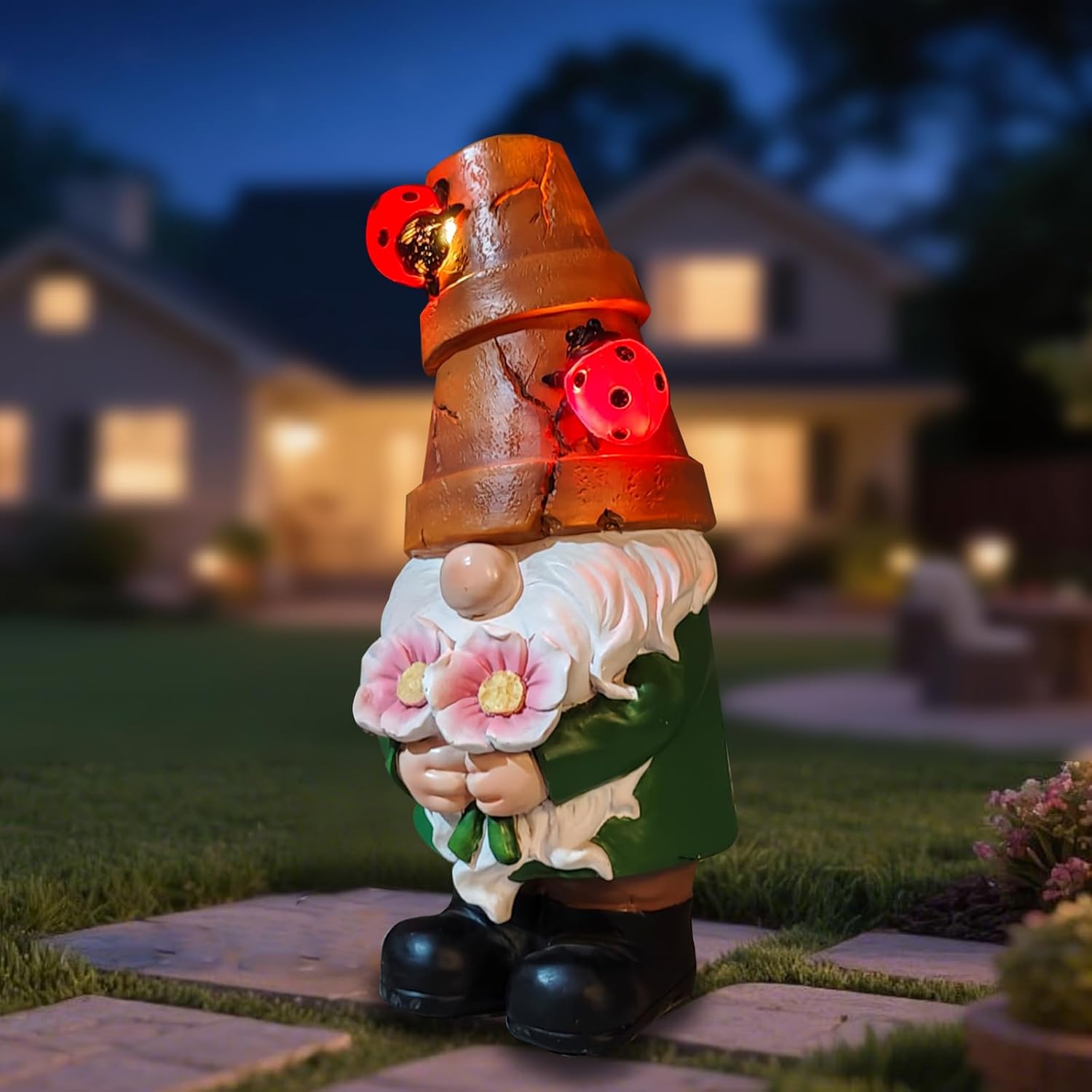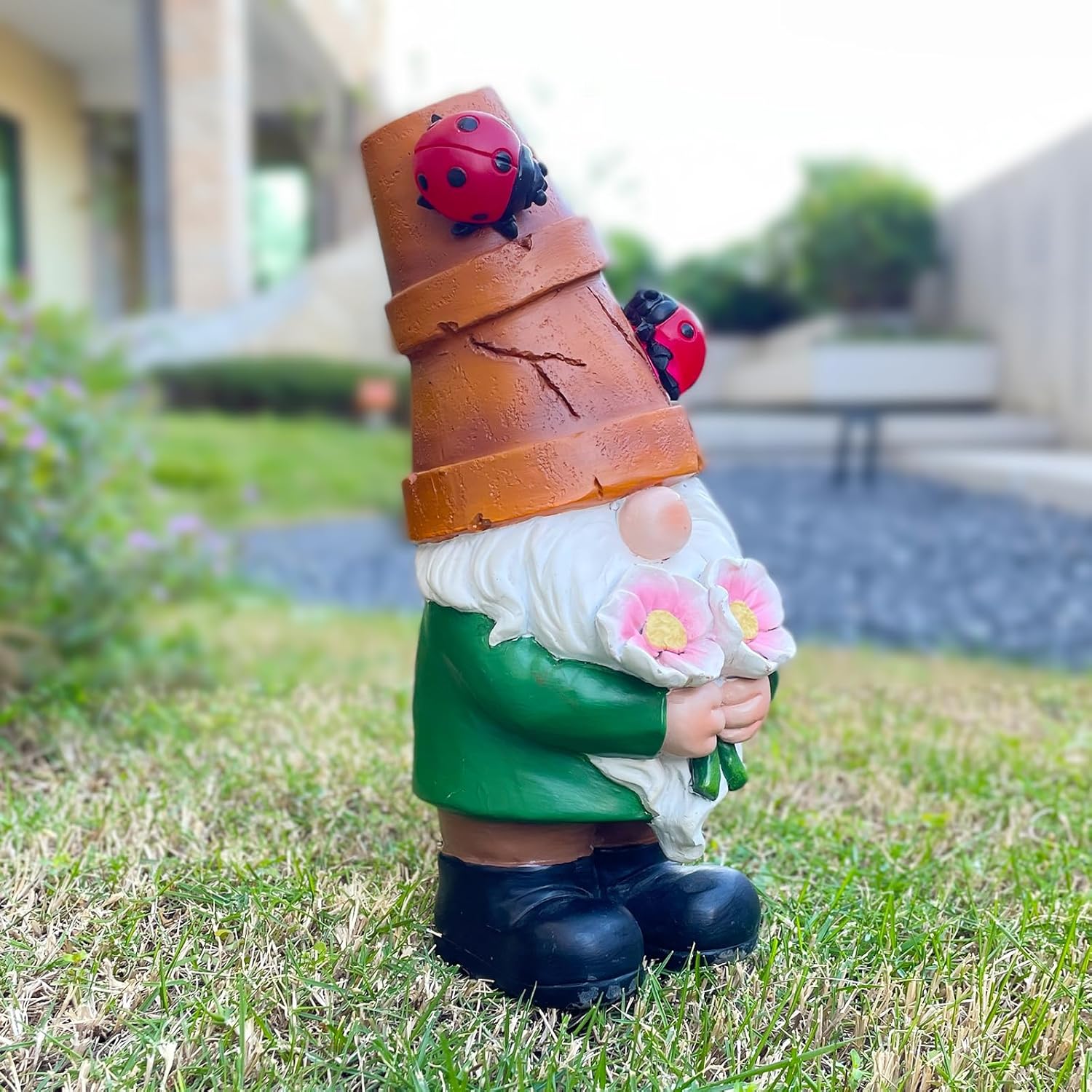 - multi-colored ladybug and flower Motif: The gnome holds a lifelike flower, while two friendly multi-colored ladybug perches nearby. This charming scene adds whimsy and warmth to your outdoor space.