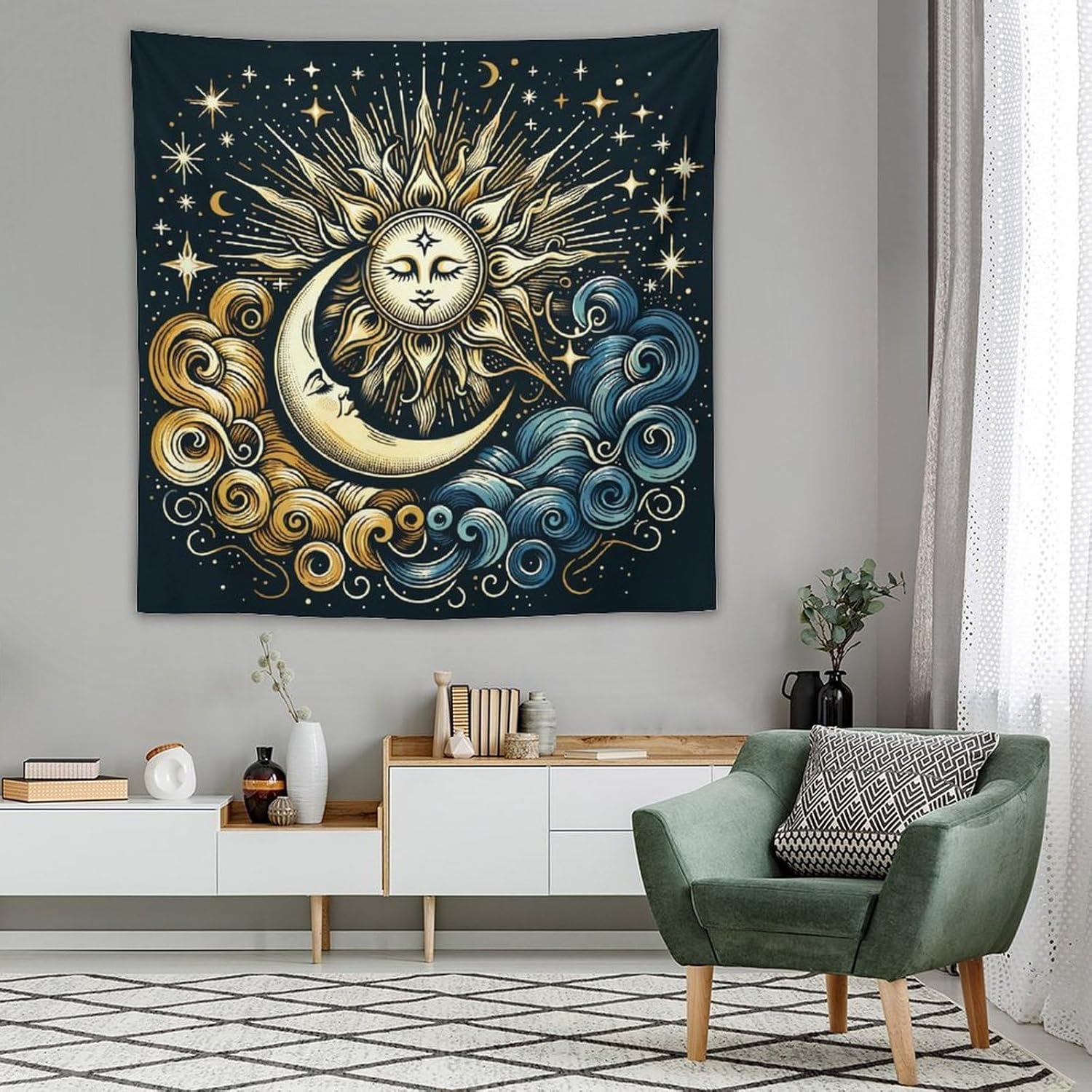 HZOHNAGO Sun Moon Tapestry Boho Golden Stars Pattern Printed Wall Tapestry Wall Hanging for Bedroom Living Room Dorm 60" W x 60" H
