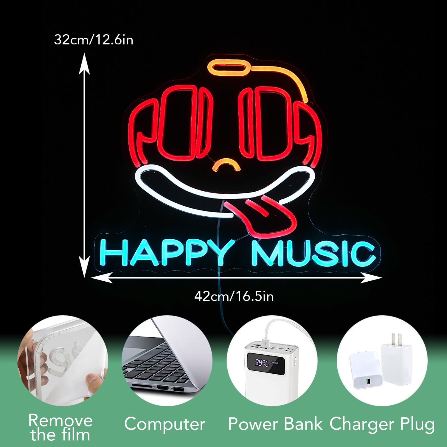 - Material and Size: The music headphones neon light measures approximately 16.5 * 12.6 inches and is designed with 5V low voltage. It consists of a flexible LED light strip, white adhesive strip, and a sturdy transparent acrylic back panel. Compared with traditional glass neon lights, it has a longer service life and no risk of glass breakage. It is not easy to heat up and can be touched with confidence
