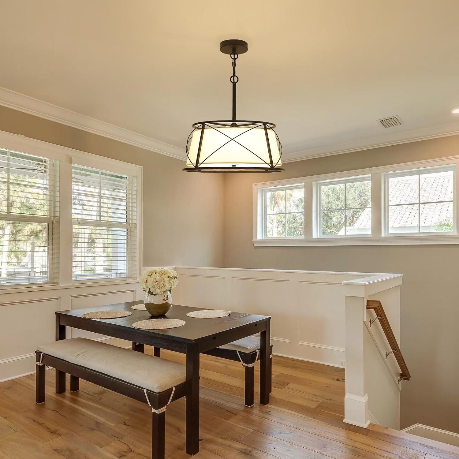 - 【Easy to Install & Quick Response】This drum pendant light comes with all the necessary installation hardware, ensuring a quick and easy install. If you have any questions about installing the dining room chandelier or any other concerns, please reach out to us. We will respond promptly and provide you with a satisfactory solution