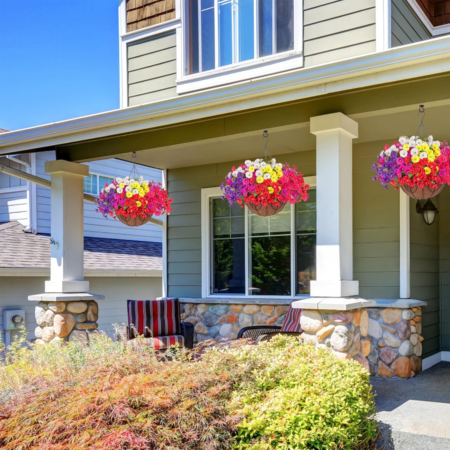 - 🟢 Durable and UV Weather-Resistant: The looking real fake hanging plants are made of high quality silk cloth and plastic, which are designed to withstand outdoor elements, and UV and all weather resistant, so they won't fade or deteriorate in the sunshine.