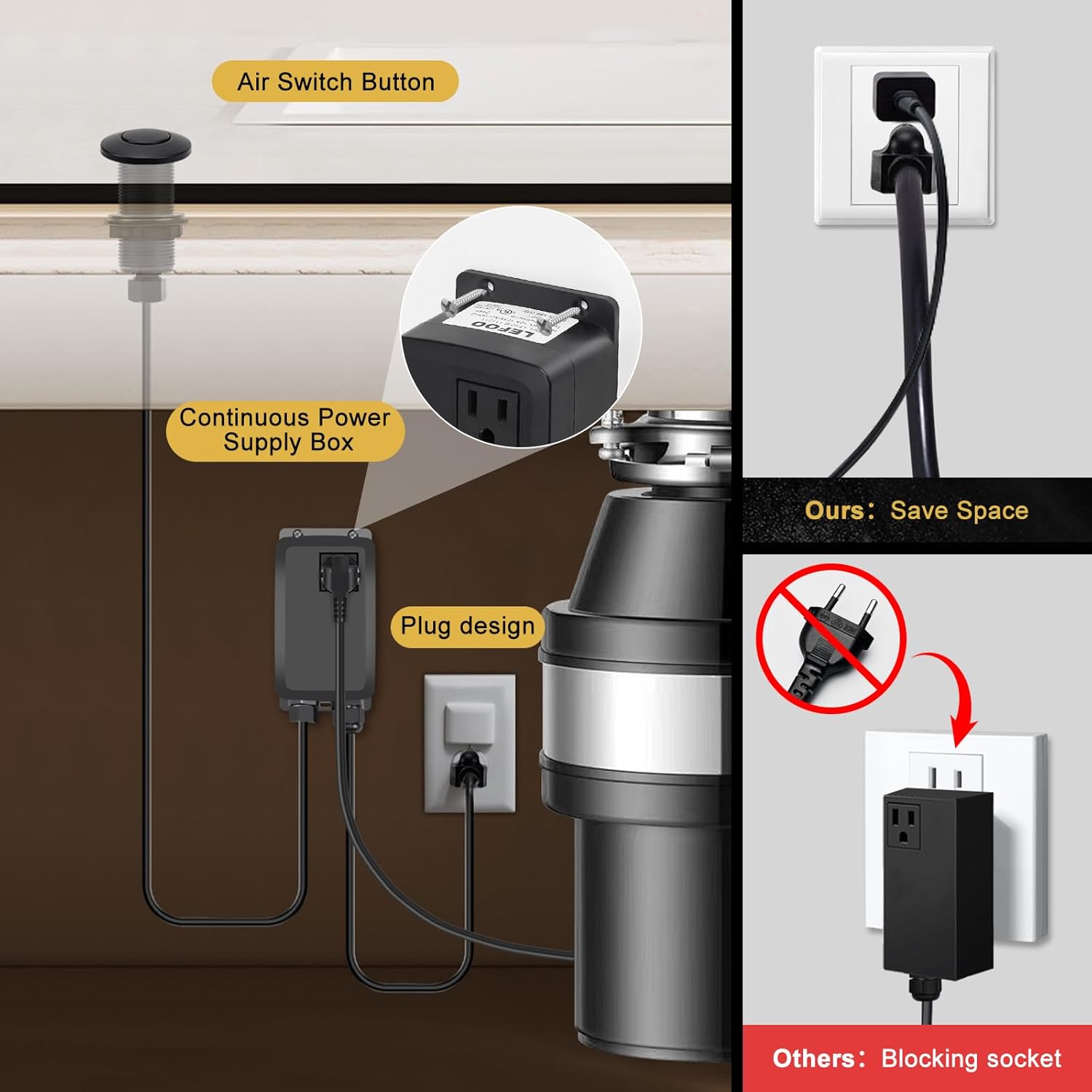 - Garbage disposal air switch kit includes: Single outlet power module, 3.3 ft long air tube, 2.5 ft power cable, stainless steel air switch button, set screws and manual (All installation accessories are included)