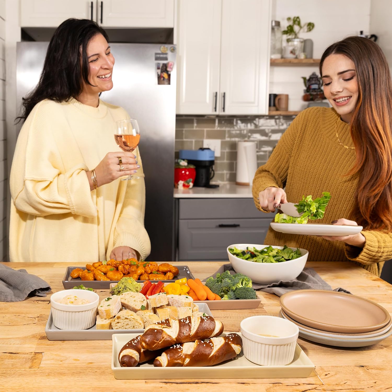 - Set of 4 Ceramic Trays – Uniquely and beautifully designed rectangular ceramic serving trays that are great for any occasion; Beautiful neutral colors will match any of your home’s decor; Each dish is 14” x 6”