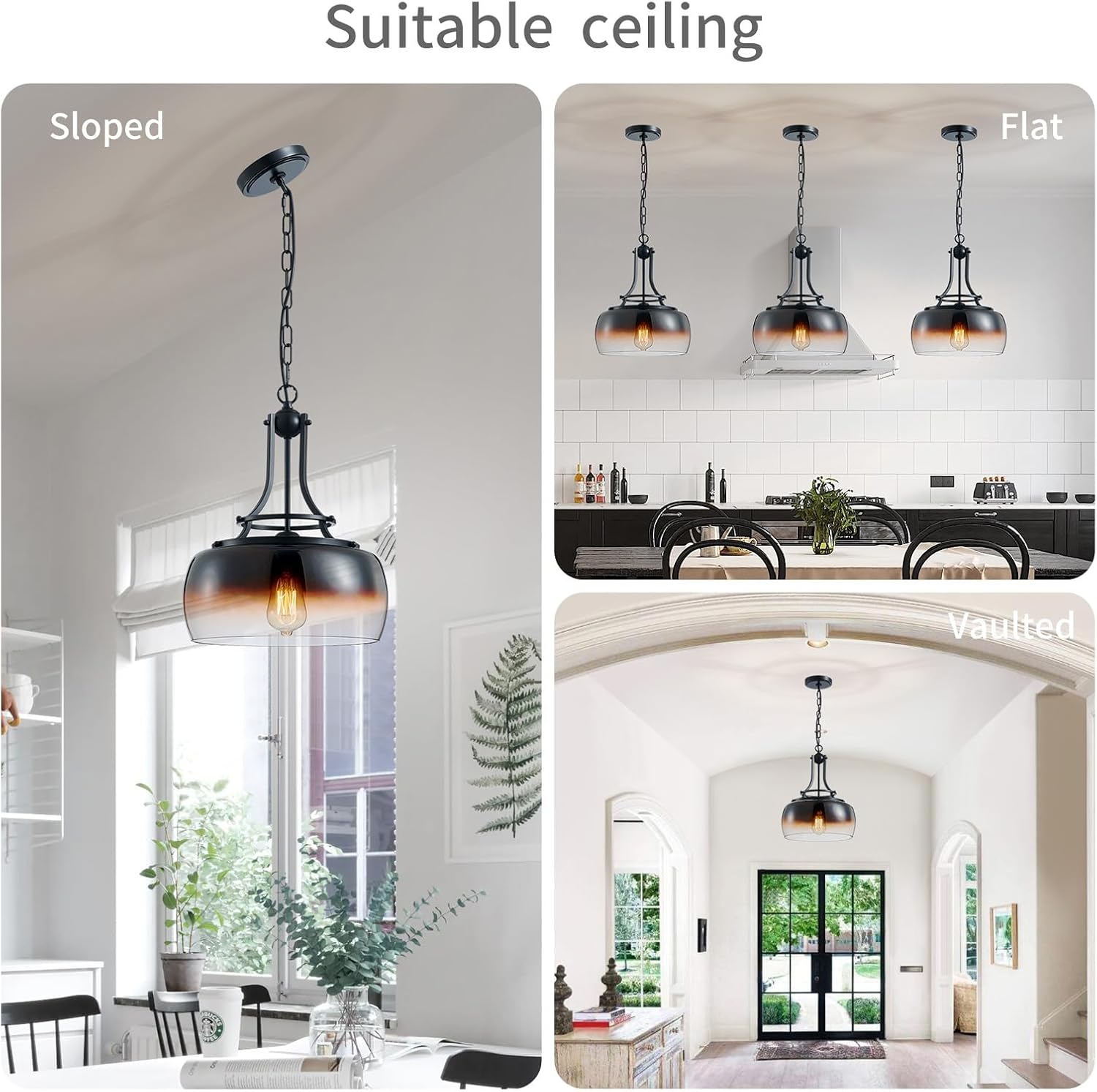 - Design: This rustic farmhouse Wuzups pendant chandelier light with design offers a modern interpretation of a classic urban-industrial style, which adds a vintage flair to your space. It comes in a black finish and features a prominent round amber gradient black glass shade. The mouth-blown glass has a few pinprick bubbles that add to the vintage look and feel.