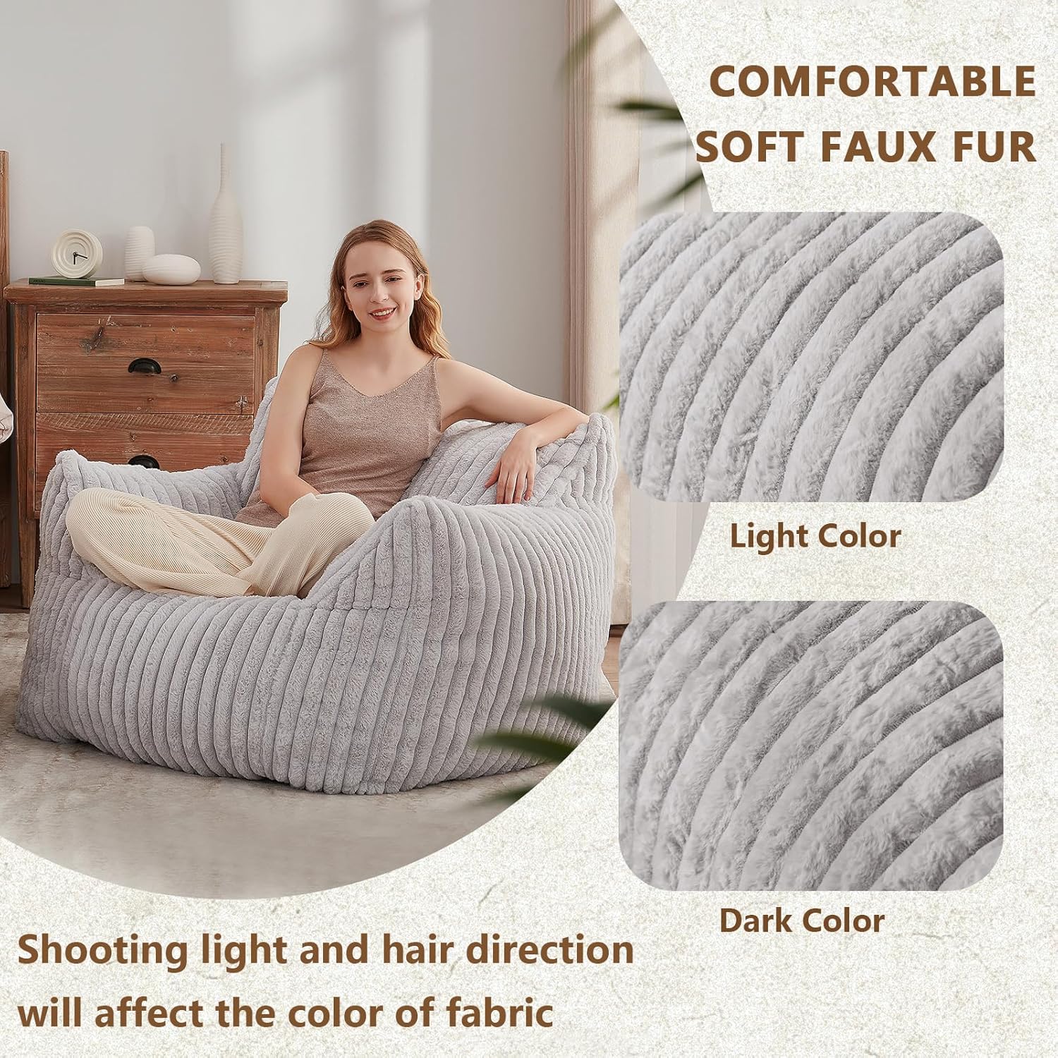 - 【Color of Beanbag Sofa】-Our beanbag chair is available in multiple colors, and it will be affected by the shooting light and the direction of the hair. Smooth hair direction will appear light colored, and inverted hair direction will be a dark color.