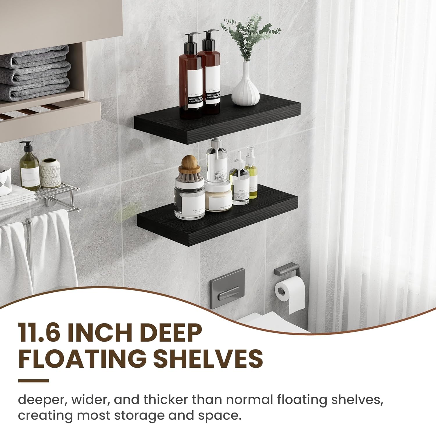 12 Inch Deep Floating Shelves, 24 Inch Long Floating Shelves for Wall, Floating Shelf with Invisible Brackets, Deep Shelves for Bathroom, Bedroom, Living Room, 2 Pack, Black