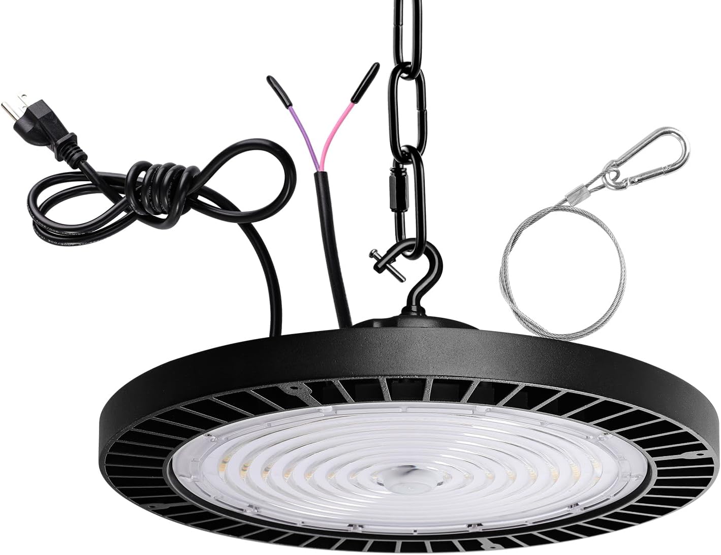 - Easy to use and install: This LED warehouse lights come with a US plug with 5FT cord, You can plug and play directly.If you don’t need the plug,please cut it,then you will see L/N/G wire,just make the wires connection. The package also including a 1FT metal chain and safety rope which makes the lights more safe .You don’t need spend much time or effort on installation.