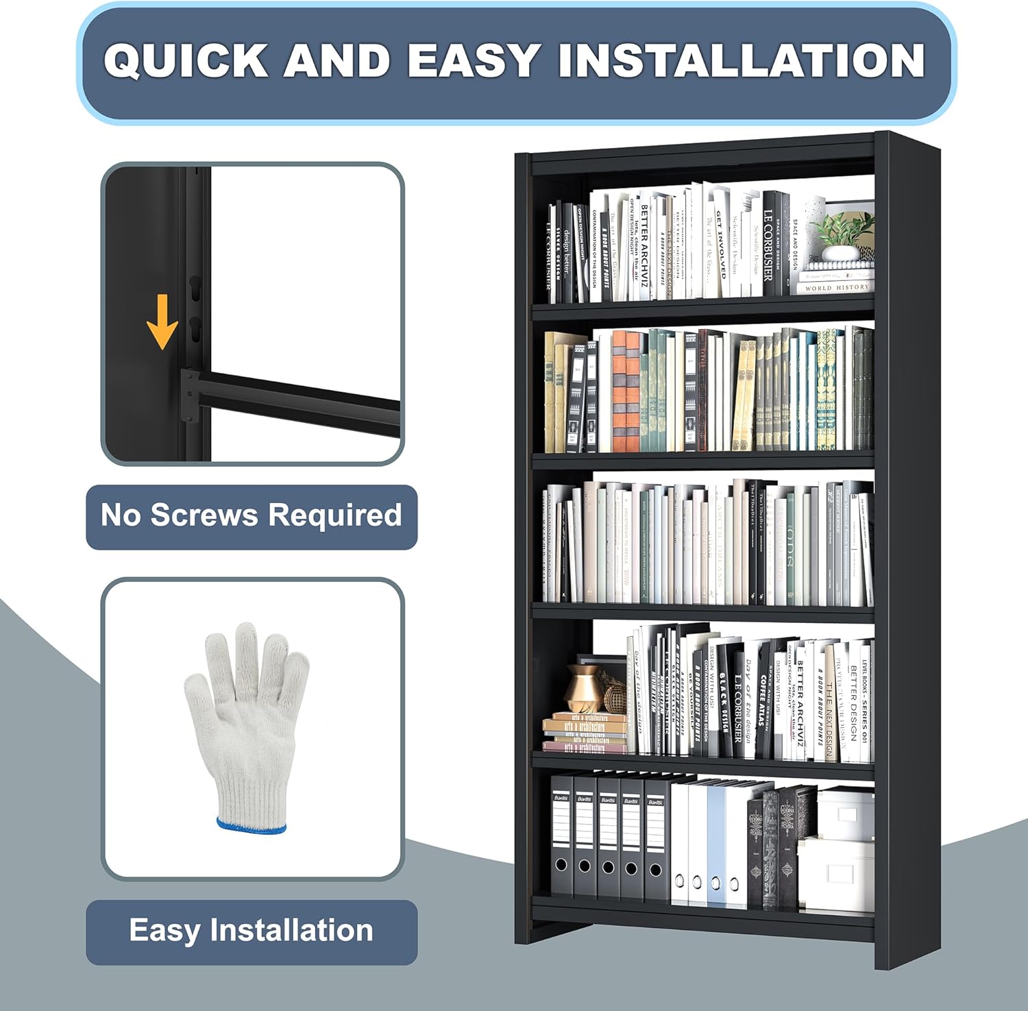 - 【Easy to Assemble】One person can install it. No screws needed!!! The metal bookshelf adopts an upgraded module assembly design, and you only need to follow the clear image assembly manual for operation. Moreover, the installation manual has marked all parts, making it easy to assemble. If you have any questions, please get in touch with us and we will provide you with satisfactory service.