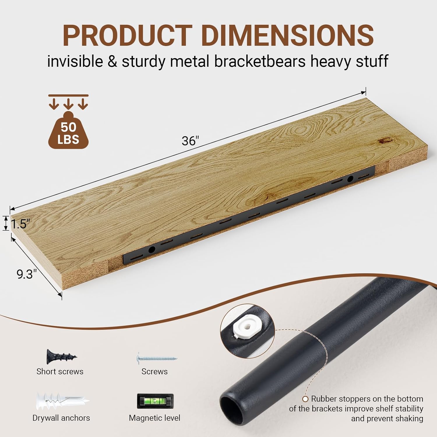 - 【Longer Design】Our pretty 36 inch wall shelves are 36"W x 9.3"D x 1.5"H.Our floating shelves oak is longer than traditional designs and can hold more items.The 36 inch floating shelf optimize wall space,helping organize essentials without taking up floor space in your home.