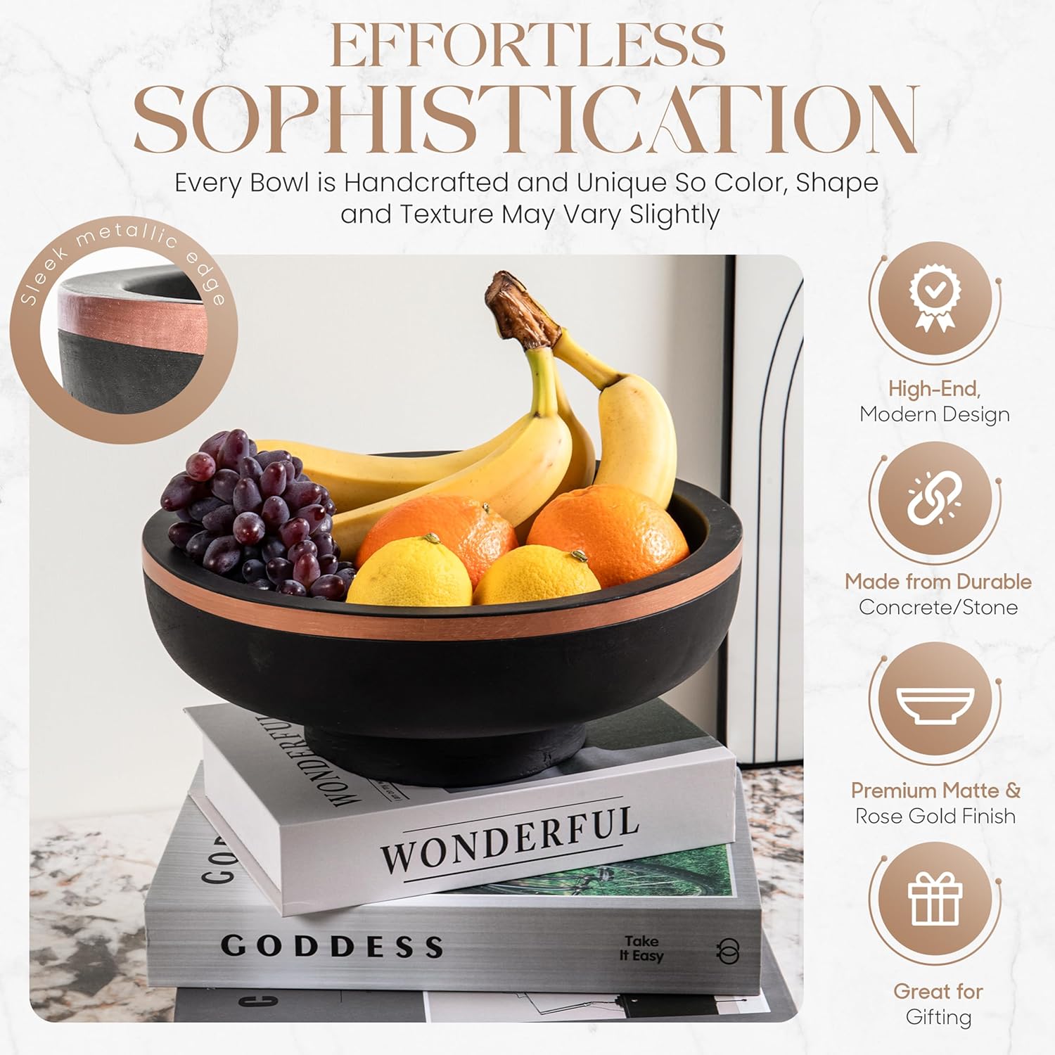 - 【CONCRETE FRUIT BOWL】 This concrete fruit bowl, designed as a stylish pedestal bowl with a matte black finish and rose gold rim, doubles as a decorative centerpiece and functional display. Ideal for use as a concrete bowl, black decorative bowl, or modern fruit holder. Elevate your kitchen counter, coffee table, or dining space with a bold, artisan-crafted statement piece.