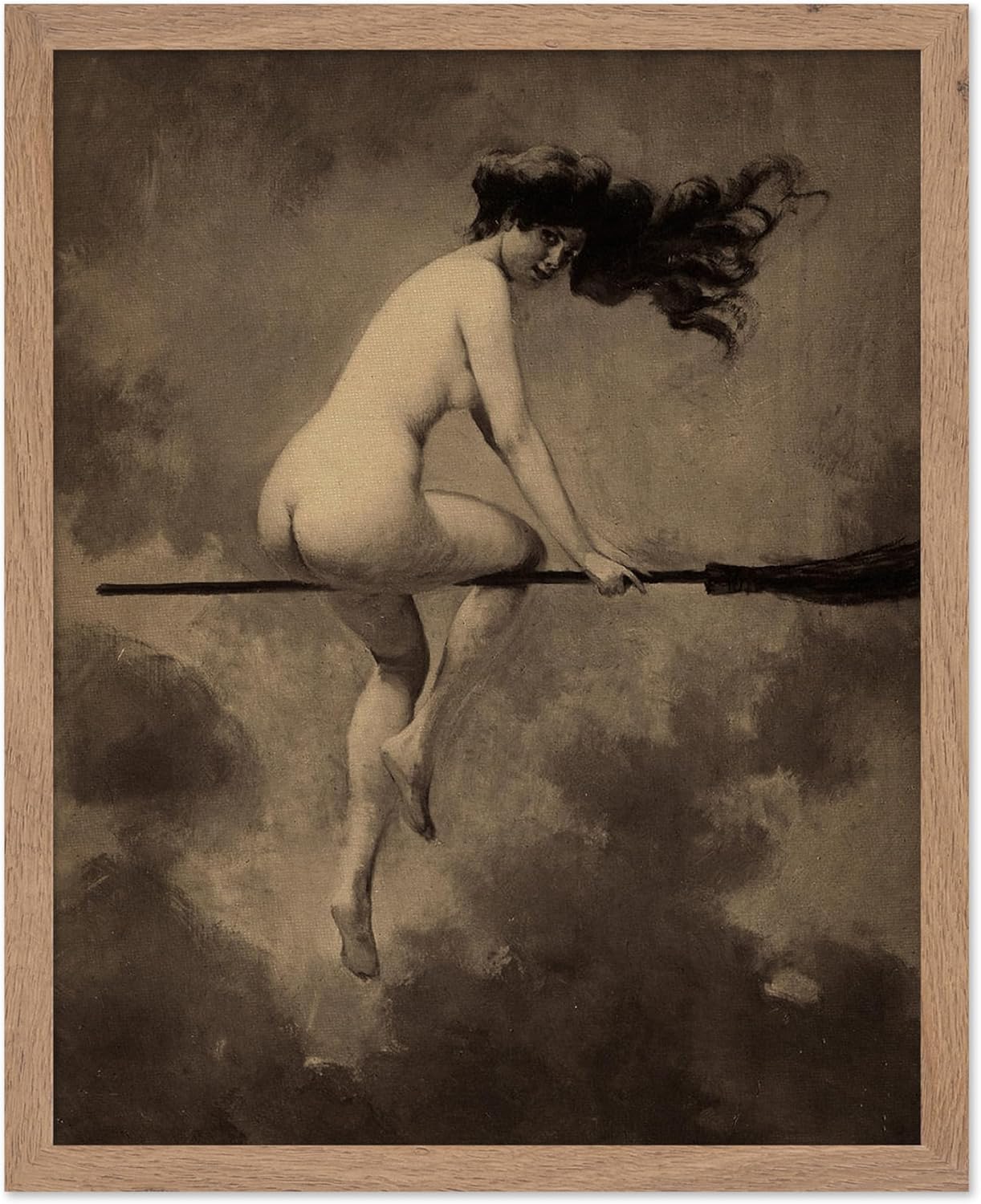Poster Master Vintage Albert Joseph Penot Poster - Retro Halloween Print - Gift for Artist, Friend - Departure for the Sabbath, Naked Witch on Broom - Wall Decor for Bedroom, 11x14 Beige Framed