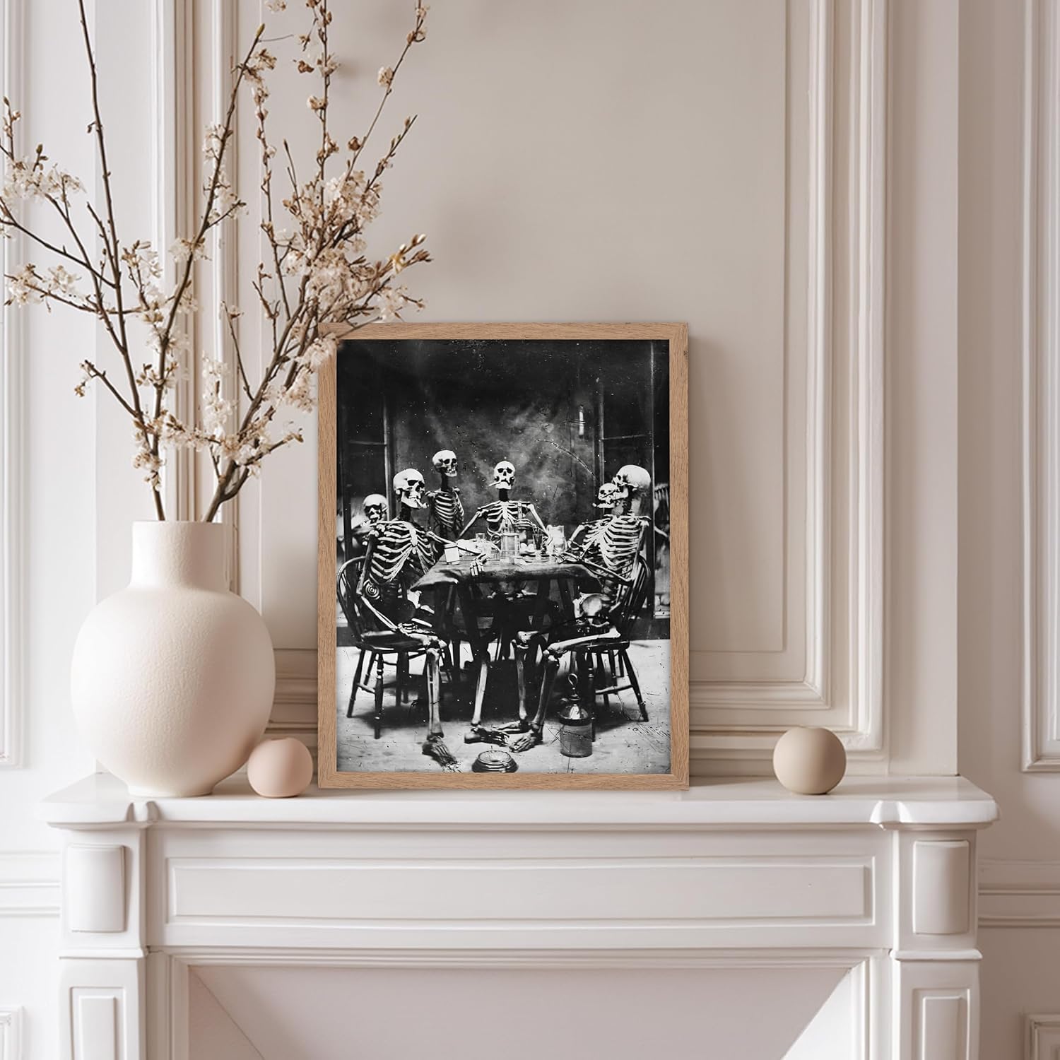 Poster Master Vintage Photograph Poster - Retro Daguerreotype Print - Gift for Artist, Friend - Skeletons Smoking at Table, Dinner Party, Goth - Wall Decor for Home, Dorm, 8x10 Beige Framed