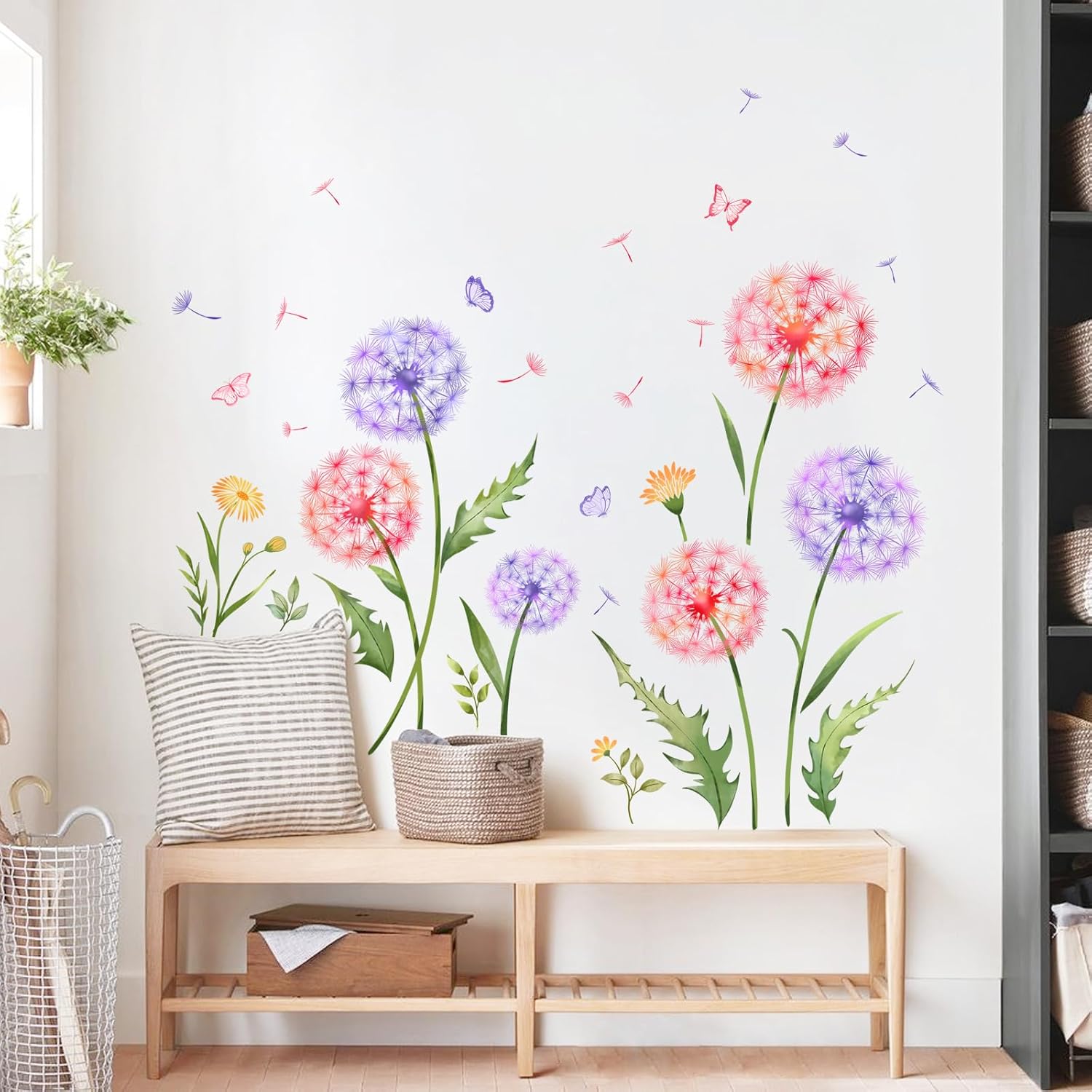 - 【Special Design】: Featuring with pink and purple dadenlion flowers and flying butterflies pattern, this floral wall art decal will give a new look to your space and make your house or office pretty and fashionable. Add a decorative element without blocking the view.