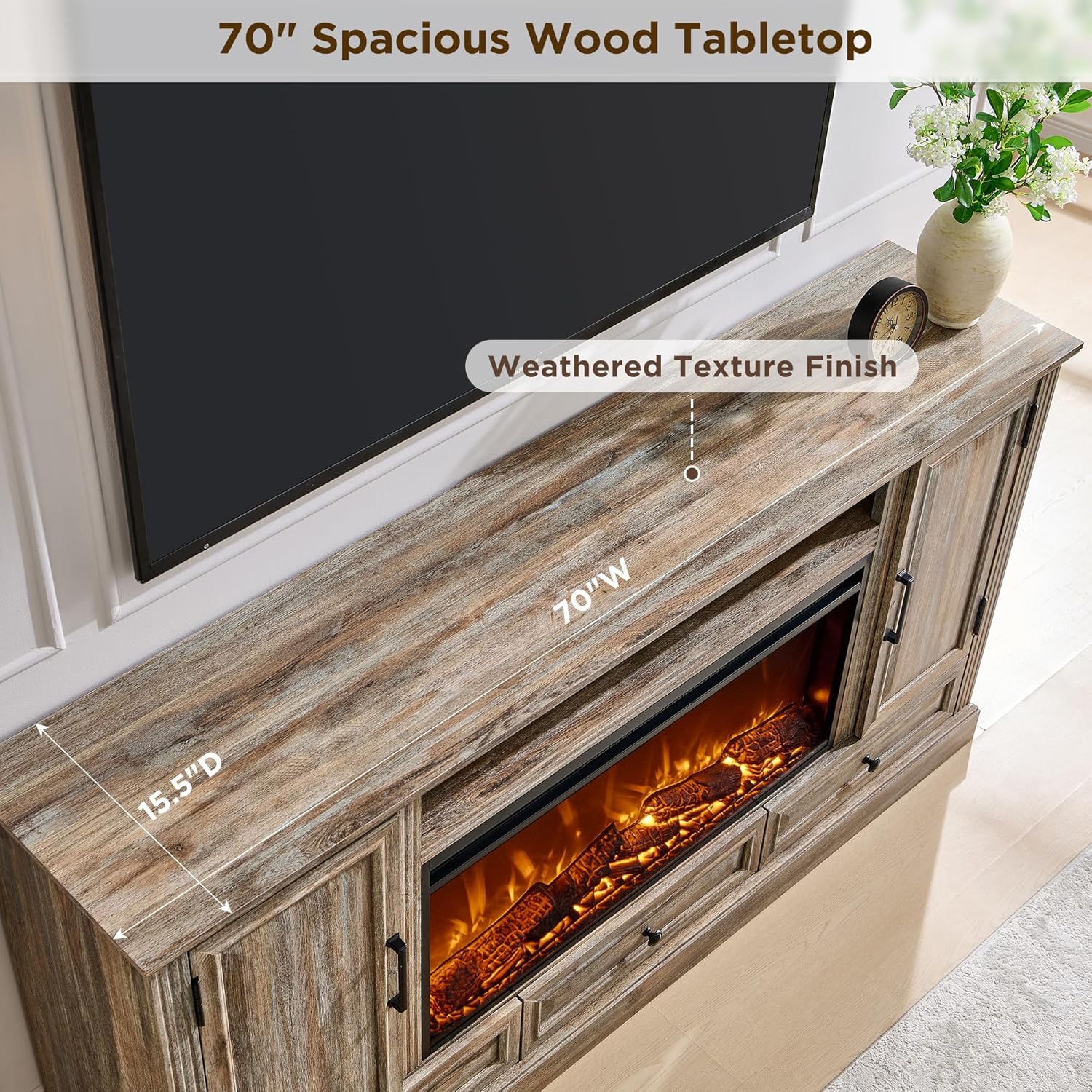 - Cozy Farmhouse Elegance: This 70 inch TV stand blends rustic farmhouse style with a cozy, welcoming atmosphere. The weathered oak finish exudes vintage farm charm, while clean, decorative line details and framed accents add a refined country touch to any room. At the heart, the realistic electric fireplace features flickering flame, glowing log, and smoldering ember, creating a warm, inviting atmosphere. It's the perfect focal point for any room, elevating your home with both style and comfort