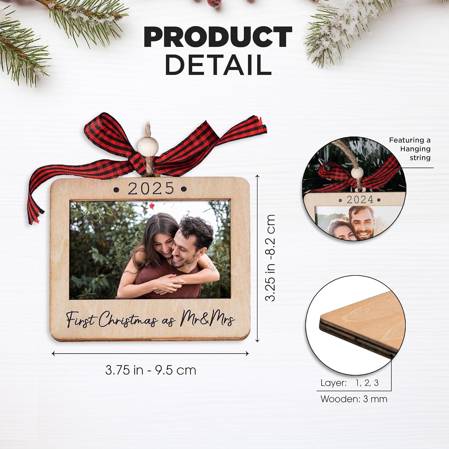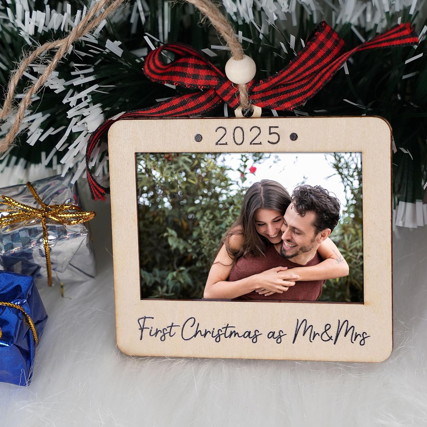 Christmas Photo Frame Ornament, 2025 Ornament, Wooden Picture Frame Ornaments With Hanging String (2025 Mr & Mrs (Landscape))