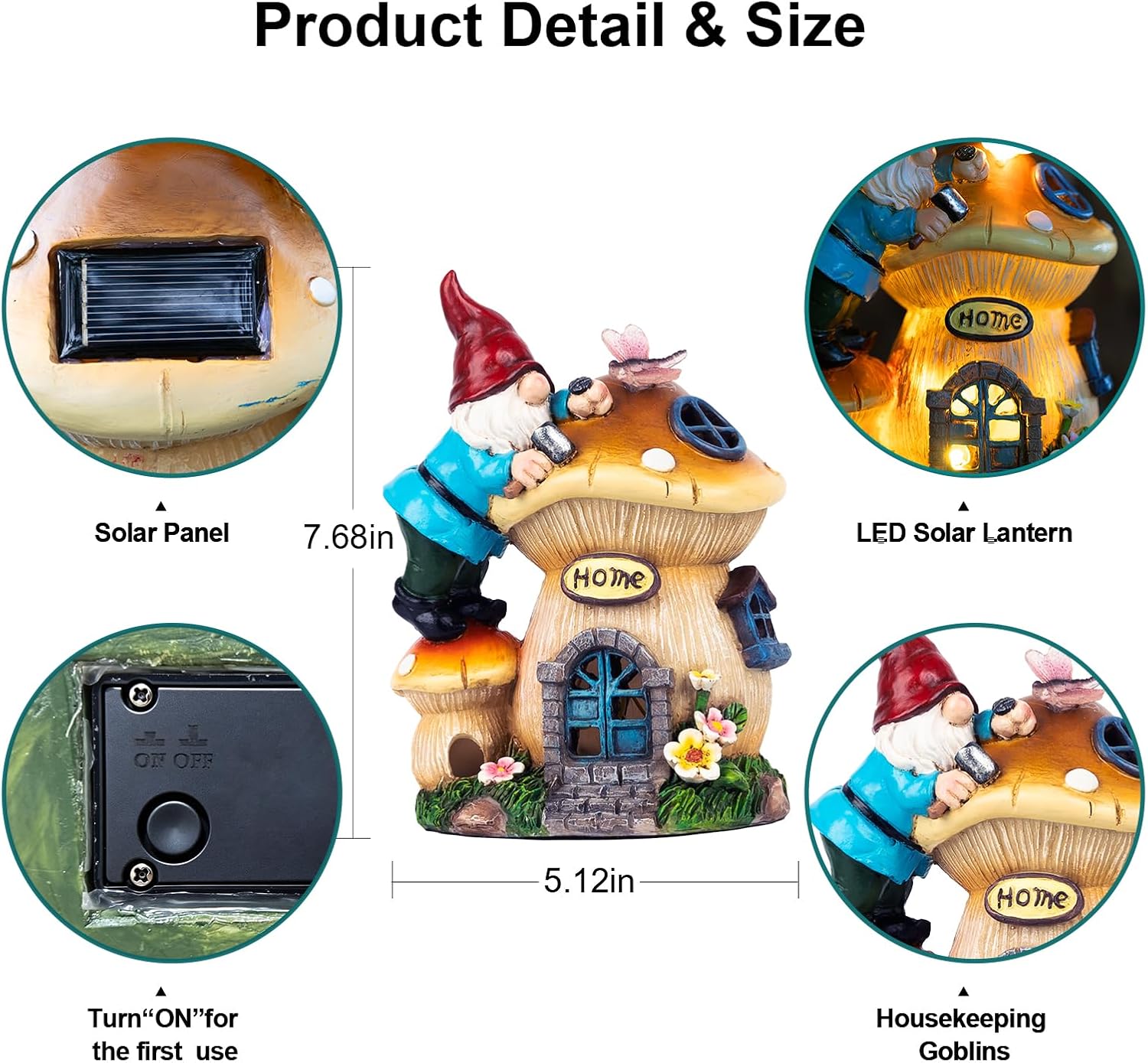 - 【Unique and Creative Design】This solar garden gnome statue is full of fantasy and creativity with the theme of gnomes building mushroom houses. Place it in the courtyard, as if you are instantly in the fairy tale world, adding a unique charm to your outdoor space.