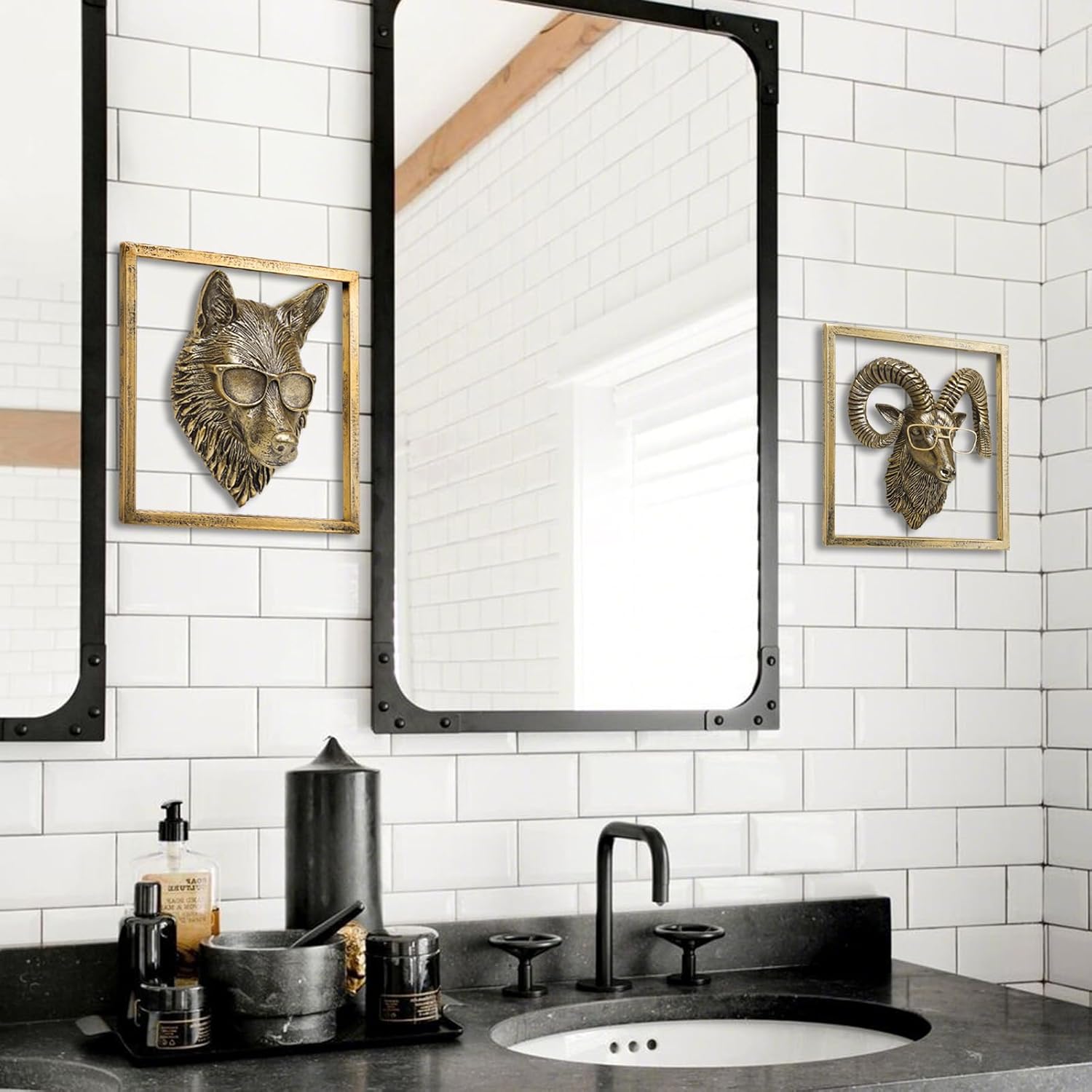 JJALIGHTS Animal Heads Wall Decor (Includes Metal Frame) Resin Animals Sculptures Head Wall Hanging Decoration Imitation Copper vintage Wall Sculpture for Living Room Bedroom Office (Wolf)