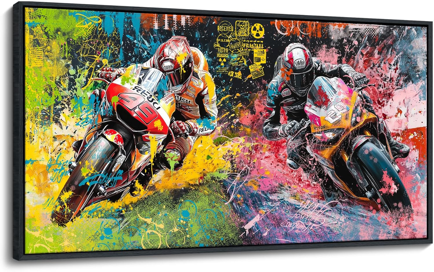 JEAWA Framed Canvas Wall Art - Large Abstract Painting Decor, Motorcycle Racing Color Graffiti Pictures, Modern Art Prints for Bedroom Living Room Bathroom Home Decoration, 29x58 IN