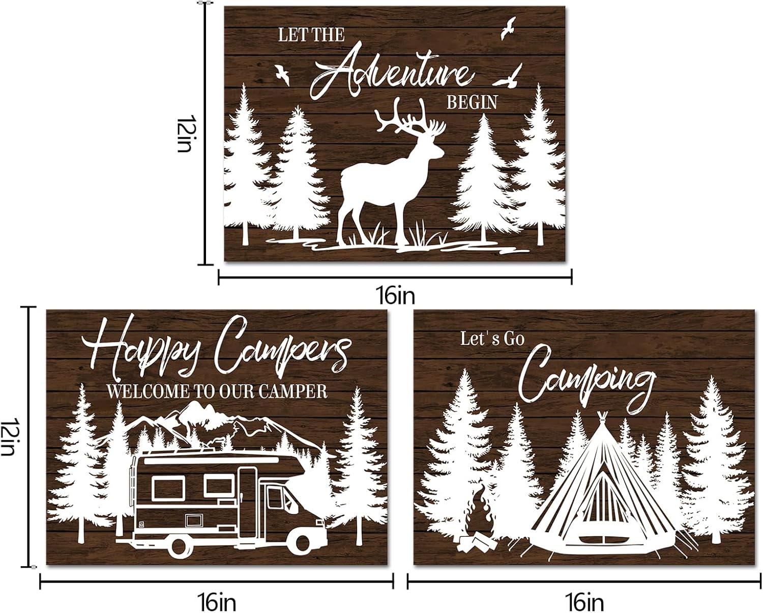 HOMEOART Camper Decor RV Wall Art Happy Campers Adventure Camping Wall Decor Sign, Deer in Forest Farmhouse Cabin Decoration,Framed 12x16inchx3Piece, Rustic Brown