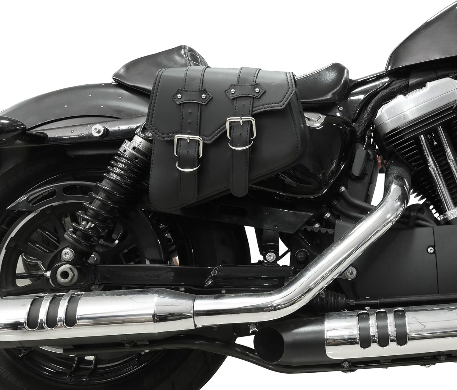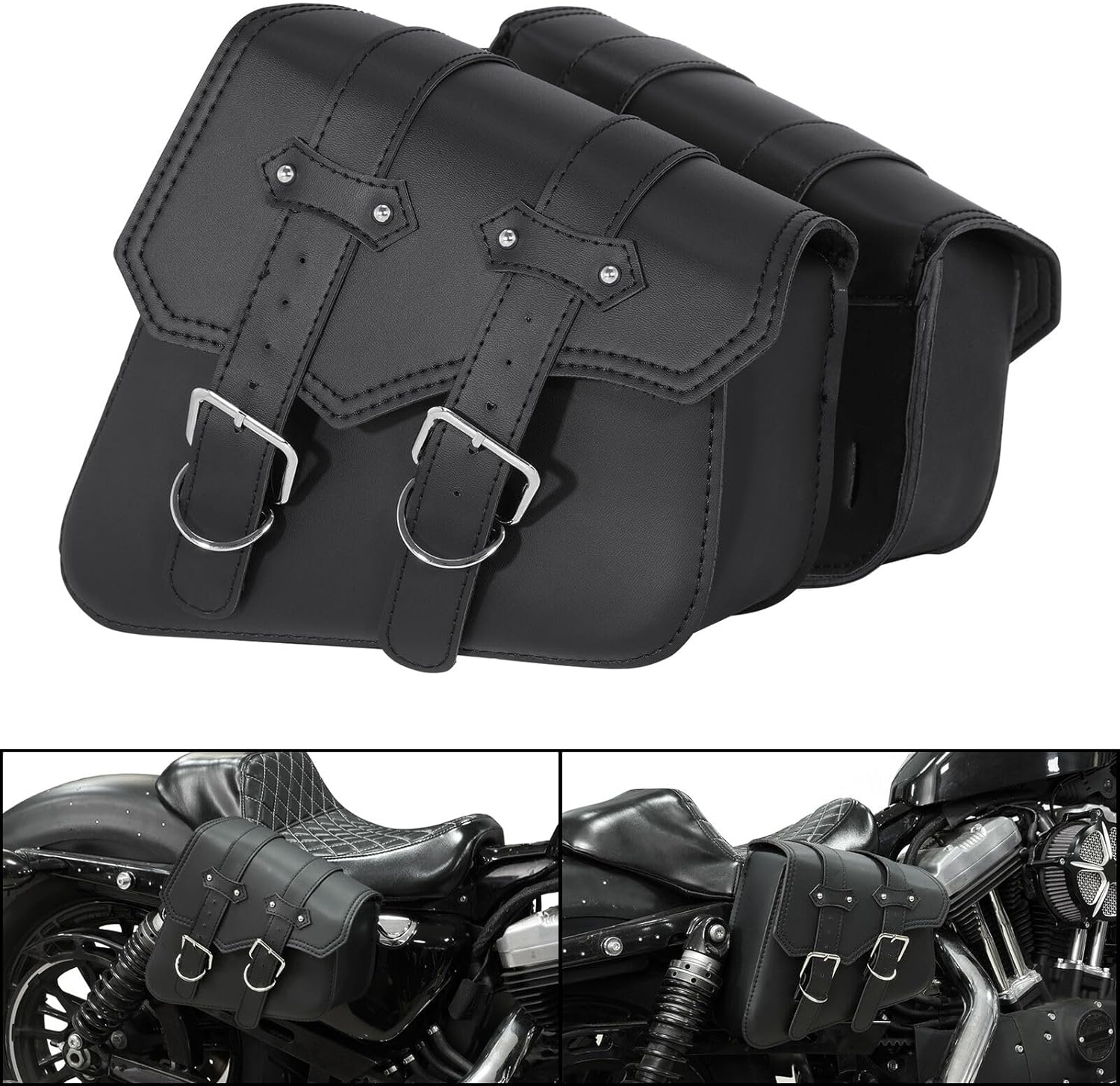 - Color: Black. Material: PU Leather. Durable: Leather motorcycle side bags made with a high quality PU material, a clean finish and a long service life.