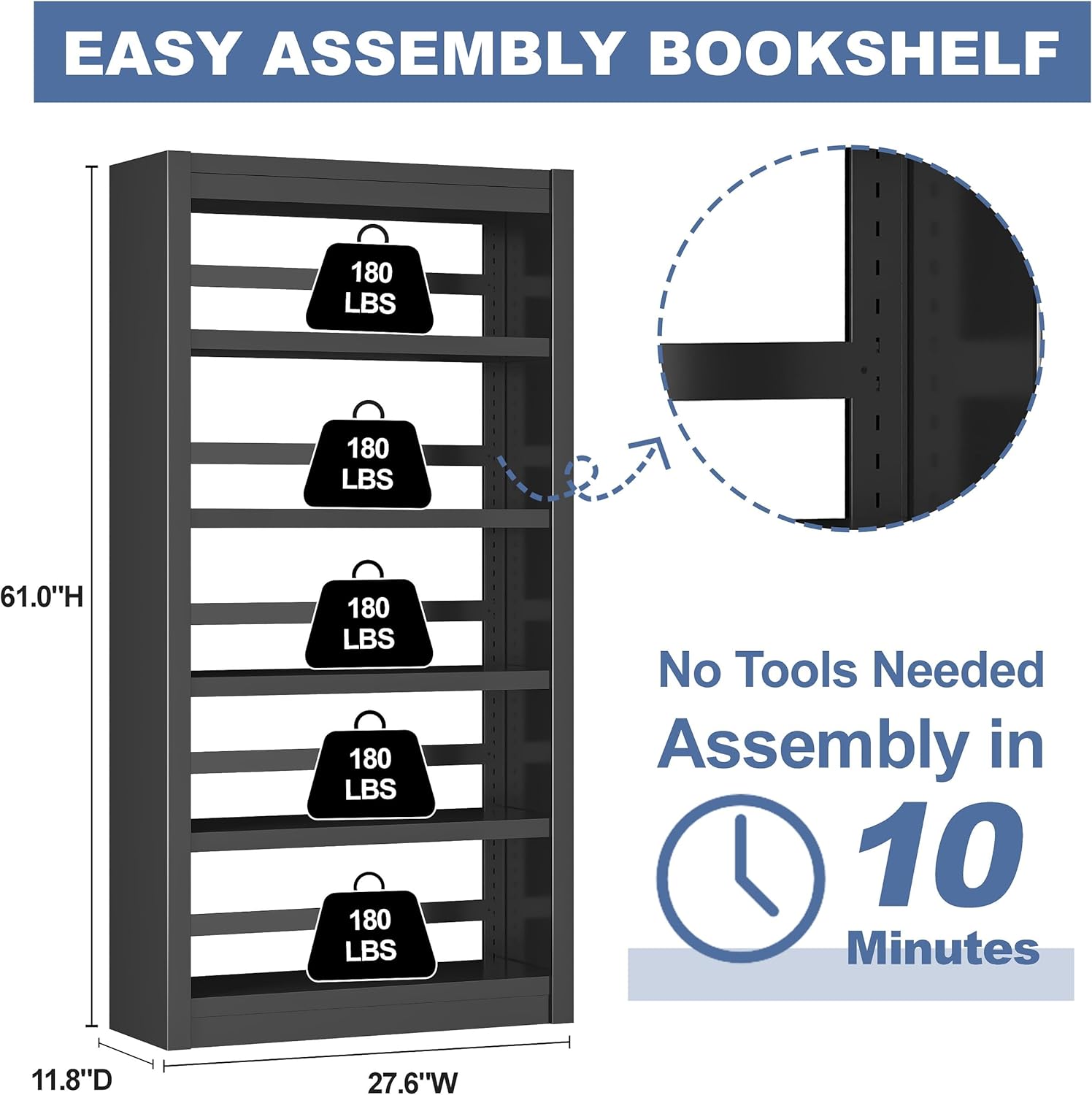 Metal Bookshelf Adjustable - 61" Tall Black Bookcase, 5 Tier Book Shelf, Tooless Assembly Book Case, Modern Bookshelves and Bookcases for Home Office, Living Room, Bedroom, Library