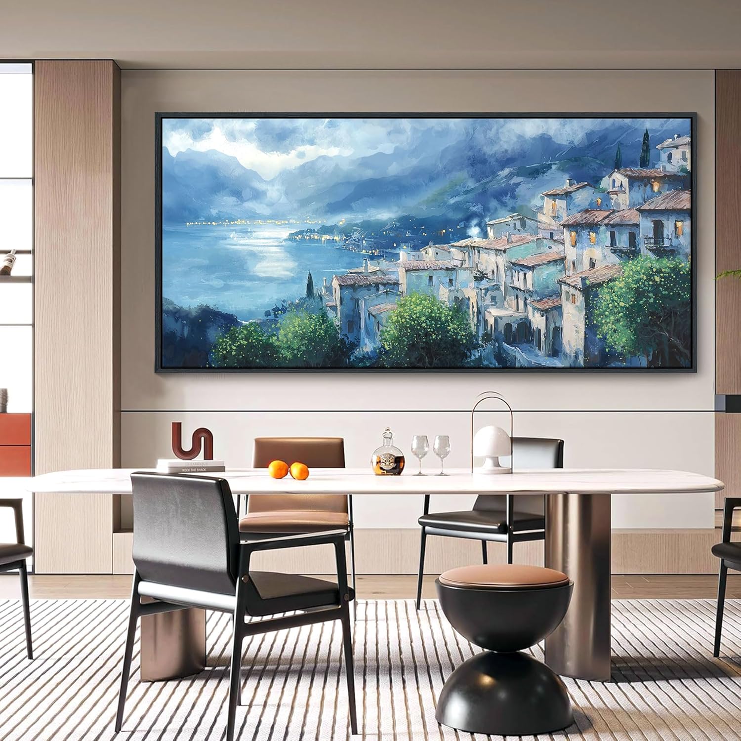- Town Landscape Picture: This canvas painting shows the dusk of the small town on the lake in the mountains, changing light and shadow, like a dream. The author's delicate and clever brushwork makes the texture of buildings, lakes and mountains realistic and fully reveals the artistic beauty.