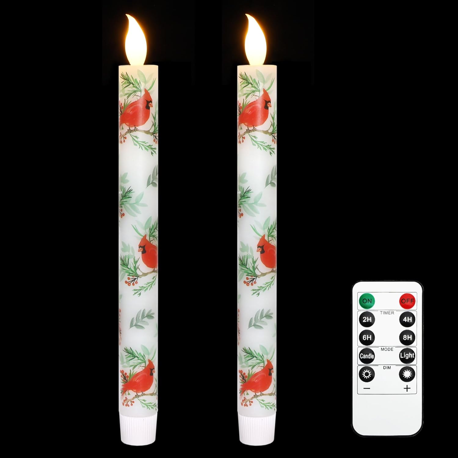 - Set Includes: Two cardinal bird battery taper candles (requires 2AAA batteries, not included), a 10-button remote control, and instructions.